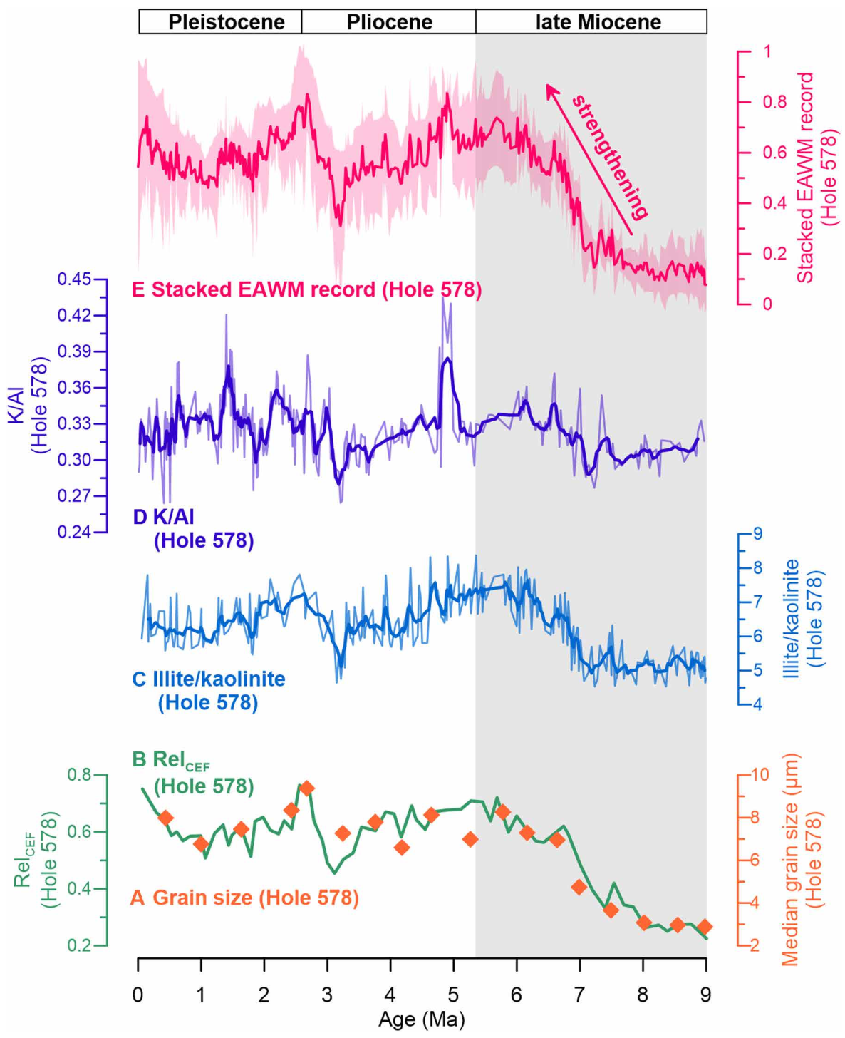 研究人员首先基于地球化学和沉积学指标的变化进一步证实了DSDP 578岩心晚中新世沉积物记录了可靠的东亚冬季风携带风尘输入历史。在此基础上,为了提高冬季风重建结果的可靠性,研究人员从风力强度和源区风化程度两个角度,基于多指标重建了晚中新世9.0 Ma以来东亚冬季风的演化序列(图2)。新记录显示晚中新世期间东亚冬季风具有显著增强趋势。中国黄土高原和东亚大陆边缘海的部分已重建记录也显示出东亚冬季风在晚中新世具有增强的特征。基于DSDP 578岩心的新记录证明了晚中新世期间东亚冬季风具有从内陆到深海大洋的大空间尺度的增强特征。