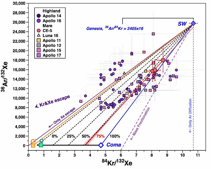 月球表面挥发性元素的来源仍然是一个备受争议的话题。稀有气体,作为挥发性元素的一大类别,在识别月壤中挥发性元素的多样性中起到了重要的作用,构建了月壤挥发性元素来源(月球大气、太阳风、地球风等)的基本框架(图1)。然而,先前对阿波罗月壤和“起源号”(Genesis)任务采集器中的“太阳风”组分的对比研究表明,两者解译出的氪(Kr)和氙(Xe)同位素存在可辨别的质量或非质量依赖分馏。这意味着,可能存在未知的过程或组分的添加改变了月壤中氪和氙的同位素组成。前人提出134,136Xe的亏损可能与67P/Churyumov-Gerasimenko型彗星组分或早期地球大气氙的逃逸相关,但对于这些机制的发生时间和结合过程缺乏统一的理解。并且,目前尚未存在一个合适的理论解释月壤中氪同位素的分馏。因此,全面理解这些机制对解释月壤中挥发分的来源、太阳风元素比通量的潜在变化、确定月球极地区域水冰来源以及验证早期地球大气逃逸均具有重要的意义。
