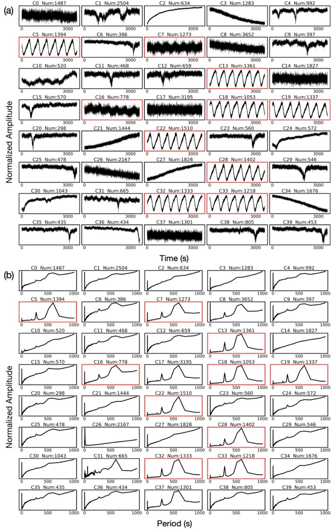 图1 (a) 波形片段聚类结果的叠加展示,以阿波罗PSE 12号站“Peak”模式下的MHZ分量为例。以1小时为时窗切片,聚类叠加后的波形。设置的聚类数量为40,每个子图的标题中说明了每个类的ID(从C0到C39)以及每个类中Peak模式片段的总数(Num)。红框展示了具有该长周期信号的类别,在叠加后的波形中可以看到清晰的长周期信号;(b)图a中片段对应的归一化振幅谱的叠加展示