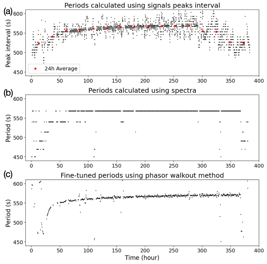 图2 长周期信号的周期变化特征。(a)根据波形峰值间隔计算得到的周期,日平均值用红点表示。结果受噪声和波形中的异常影响,稳定性较差,样点较分散,尤其是在日落和日出时;(b)使用3小时片段的振幅谱计算得到的周期,滑动步长为30分钟;(c)对振幅谱计算的周期进行微调后得到的周期