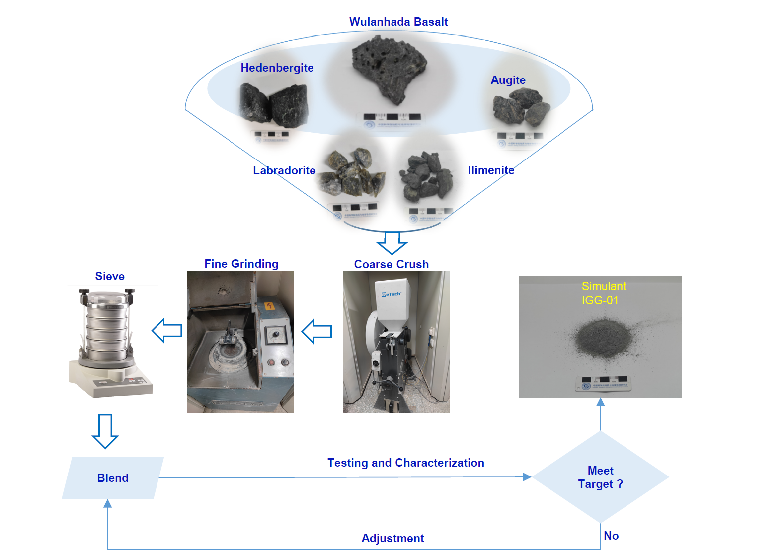 图2 IGG-01模拟月壤的制备过程,首先在鄂式破碎机中将样品研磨低于3mm的粒径,随后在盘式研磨仪中按配方进行混合和细致的研磨,最后筛分获得小于130目的粒径样品,调整模拟月壤的粒径分布以确保与嫦娥五号月壤匹配