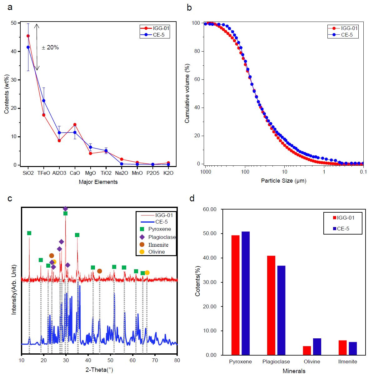 图3 IGG-01模拟月壤和嫦娥五号月壤的对比,包括:化学成分(a)、粒径分布(b)、XRD模式图(c)以及相应主要矿物相的含量(d)