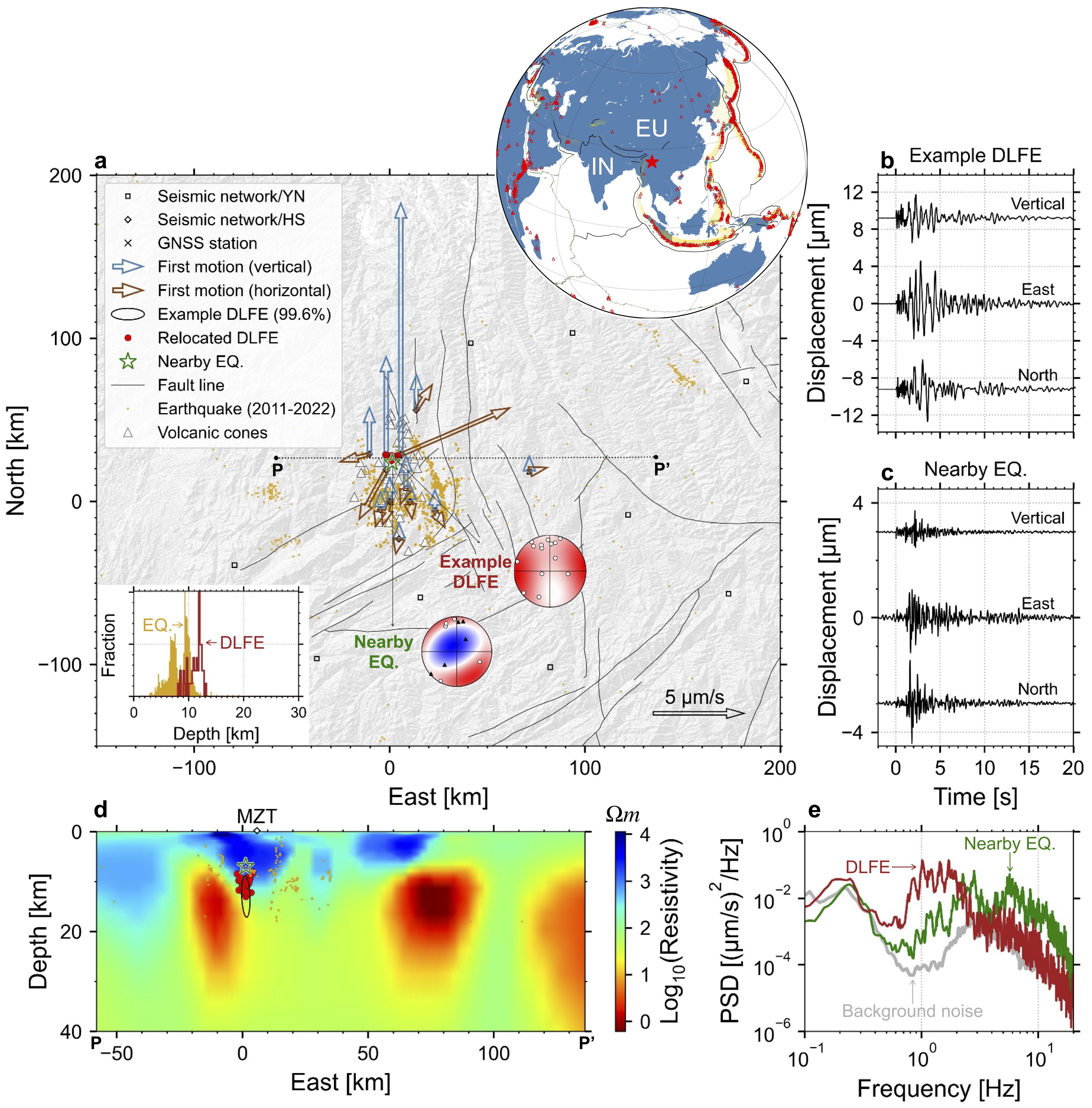 活跃的火山岩浆系统通常存在于全球俯冲带、裂谷和热点区域,伴随着不稳定的岩浆动力过程和可预估的灾害风险。虽然部分远离上述区域的板内火山在全新世内发生过岩浆喷发、在现今存在可探测的结构异常以及地球化学异常,但是这些板内火山岩浆系统的活跃程度是难以评估的。800彩票地震学课题组牛杰明副研究员、地球-行星内部结构与过程课题组王新副研究员和陈棋福研究员、联合云南省地震局和北京大学在我国境内首次观测到了深部低频地震事件,论证了在青藏高原东南侧腾冲火山下方可能存在不稳定流体(大概率是岩浆)迁移过程。这类地震事件在全球广泛存在,但局限于岛弧火山、热点火山、裂谷火山、俯冲板片和少数断层区域。
