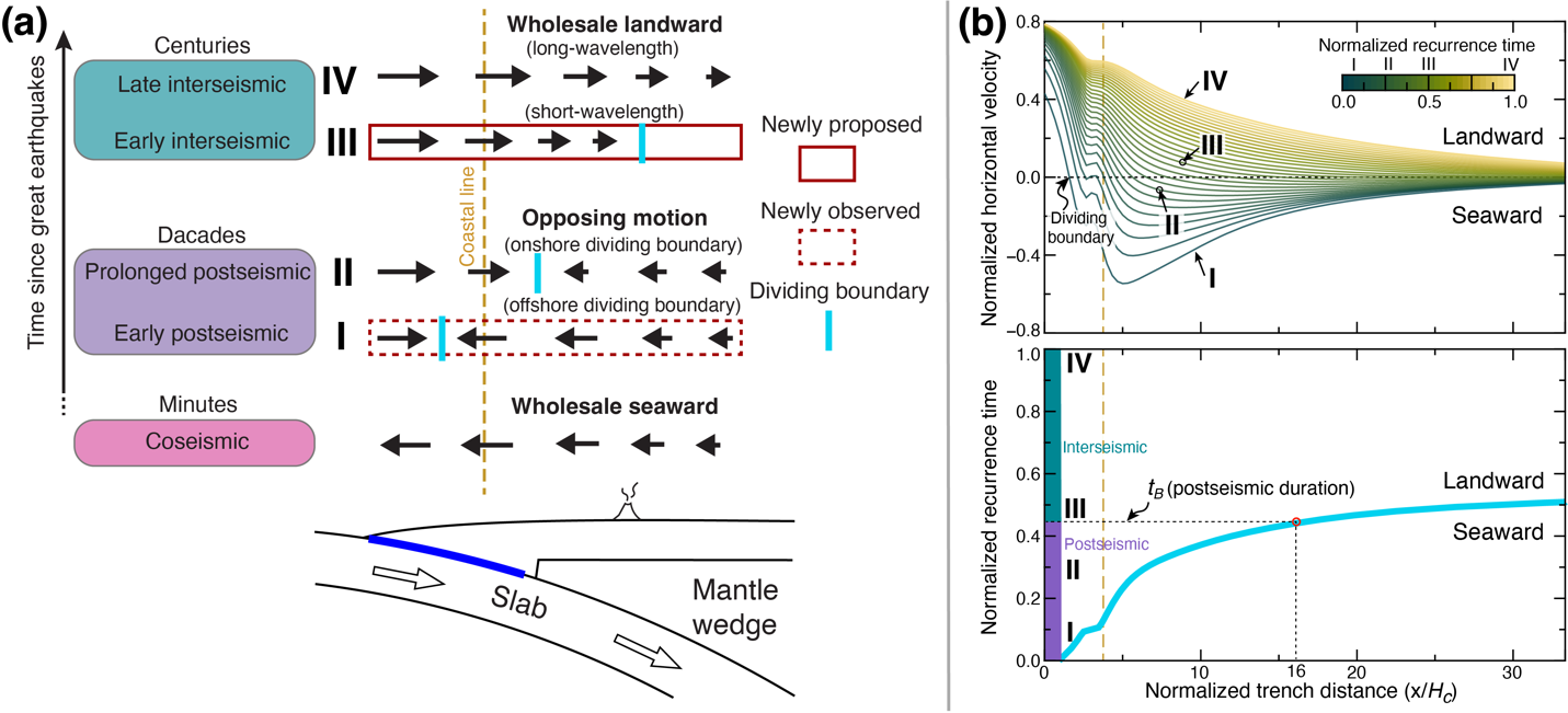 21世纪以来,通过海底GNSS等新的观测和新的理论研究,已在理解处于不同地震周期子时期的水平形变特征方面取得重要进展,但对于大地震的地震周期形变完整演化过程,还缺乏系统性、框架性认识。另一方面,全球气候变化下的表生过程研究(如海平面上升、地面沉降等),需要更精细的地震形变模型定量分离固体地球垂向形变分量,克服垂向形变观测信噪比相对低、量值相对较小但蕴含物理过程相对复杂等问题,进而深入研究圈层耦合下的表生过程。针对上述两方面问题和需求,800彩票岩石圈演化与环境演变重点实验室李绍阳特聘研究员和陈凌研究员在前人工作的基础上,总结俯冲大地震震后四个子时期水平形变特征的最新认识(图1a),并设计仅与时间和空间相关的两个无量纲参数(即地震复发周期与黏弹性松弛时间之比T/tM、发震层厚度与上覆板块弹性厚度之比D/Hc),进而构建由这两个参数控制的普适性黏弹性地震周期模型。该模型预测的地表形变连续时空变化特征能自洽地解释所有水平观测(图1b),证明虽然不同俯冲带现今可能处于地震周期的不同子时期(即图1中的I-IV),但它们都遵循相同的地震周期性演化物理过程,即俯冲大断层周期性锁滑过程及与此耦合的地幔黏弹性松弛过程。基于该普适性模型,研究者进一步预测出时空连续的水平和垂向地震周期形变特征,进而:1)绘制出大地震震后/震间持续时间相图(图2a),发现现今俯冲带观测存在关键时空空白(图2b);2)揭示3个关键垂向形变特征(图3)及其时空变化(图4),从而提出俯冲带黏弹性地震周期形变及其动力学内涵的新认识。