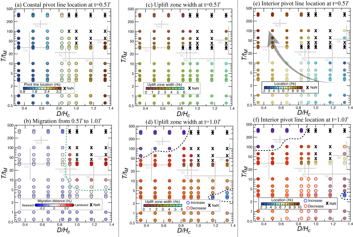 图4 a和b、c和d、e和f分别为CPL、UZ和IPL受控于T/tM和D/Hc的时空变化。上排和下排分别为震间早期和晚期的数值模拟结果。X符号代表上覆板片地壳形变为完全下沉,无CPL、UZ和IPL信号