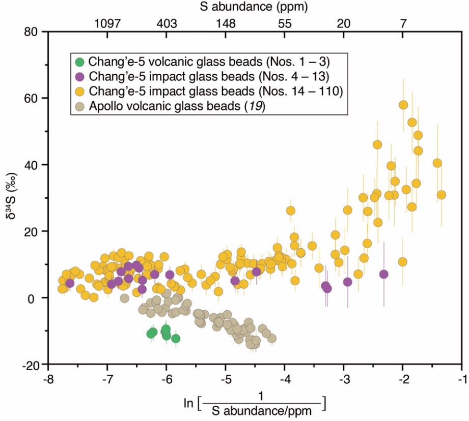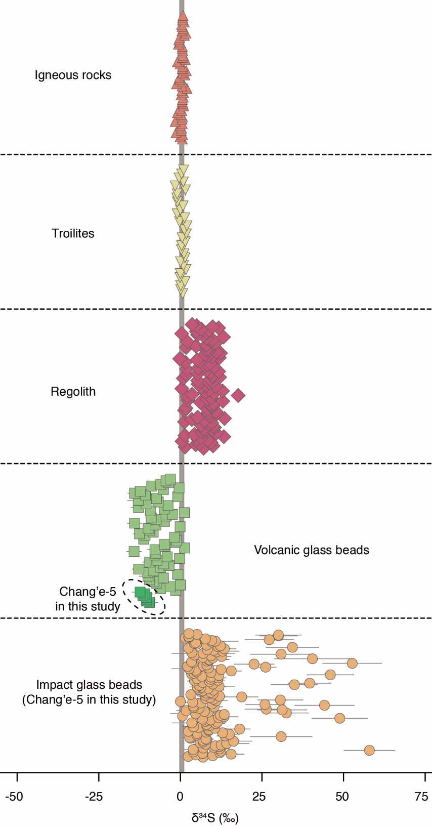 元素的同位素特征带有样品的“指纹”信息,可以记录源区信息和改造过程。在撞击和火山过程中均存在挥发性元素的丢失(去气),这两个过程截然不同的去气环境会导致挥发性元素同位素不同方向的分馏。前人对火山玻璃珠的研究表明,火山玻璃珠的S同位素较轻并且S同位素值与S含量呈现正相关关系。然而,目前没有关于冲击玻璃珠S同位素的相关研究。已知月球火成岩及陨硫铁的δ34S 均在0 ‰附近(图2),以此为原材料被撞击形成的月球风化壳则具有显著偏正的硫同位素组成,说明这些岩石在经历撞击风化过程中32S丢失的更多。本研究对嫦娥五号冲击玻璃珠的S同位素进行测量,发现其S同位素偏重且和S含量呈负相关的趋势,这与理论预测相符(图3)。因此,S同位素特征可以作为区分玻璃珠成因的关键证据。对筛选出的6颗潜在火山玻璃珠进行S同位素分析,发现只有3颗其δ34S是负值,在-12.3 ‰ 到 -9.5 ‰之间。结合结构-成分-主量-微量-同位素多方面判据,可以判断这三颗为火山玻璃(图3)。