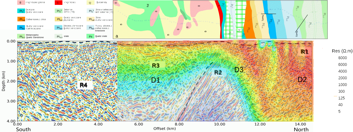 在大量样品实验室测定分析和浅层电阻率剖面地质露头对照统计的基础上,确定白云鄂博稀土白云岩包括中低品位铁矿稀土白云岩具有中高阻电性特征(李亮等, 2024),为白云鄂博矿区电磁法探测数据解释提供了岩石物理依据。在不同反演方法对比的基础上,通过与矿床地质与钻探结果的对比优选AMT反演方法。矿区尺度AMT反演结果揭示了白云鄂博矿区电性结构特征(图1):整体可分为南部高阻带(D1)、北部低阻带(D2)和中部过渡带(D3);北部低阻带对应厚度巨大白云鄂博群裂谷沉积,南部高阻带白云鄂博基底杂岩和变质岩,局部对应成矿后侵入的花岗岩;白云鄂博稀土矿床位于中部过渡带(图1)。矿床尺度加密测点(点距20米)AMT反演剖面(图2)与三维成像结果(图3)清晰揭示白云鄂博“Y”型控矿构造特征,矿床在浅部被低阻板岩分割成南北两个矿带,南矿带局部矿体(稀土白云岩)与围岩交错发育。结合矿床地质以及矿区的地震勘探资料综合分析认为白云鄂博矿床的构造背景为克拉通边缘裂谷,岩浆由北向南高角度侵入白云鄂博群,北部厚层沉积为矿体的保存提供保护隔层。