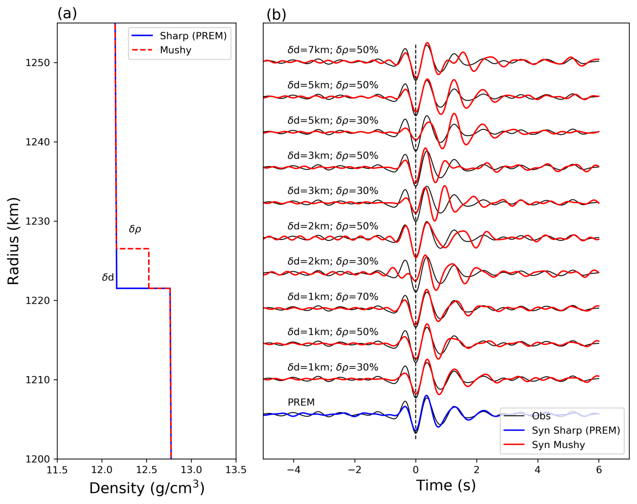 表示相对于PREM模型(蓝色线所示)在内核边界处糊状层的密度跃变值;(b) 理论PKiKP波形。通过一系列具有糊状层的内核边界模型生成的合成波形(红色波形)与尖锐内核边界PREM模型的波形(蓝色波形)的对比,其中黑色波形表示观测到的PKiKP波形