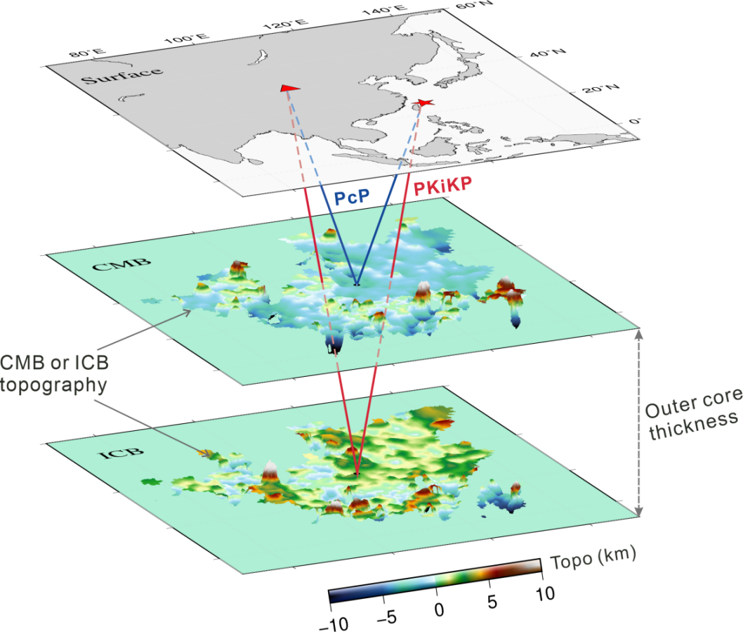 地球固态内核与液态外核的边界(内核边界)是地球内部的一阶间断面,该边界性质对理解地球内核增长、外核对流和地磁场驱动力具有重要科学意义。现代地震学已经揭示内核边界并非完全横向均匀,存在局部小尺度地形起伏和糊状层的复杂结构。然而,由于地震观测数据的限制,前人对于东亚下方的内核边界研究仍聚焦于零星分散的局部区域,缺乏对东亚地区内核边界结构整体的认识。