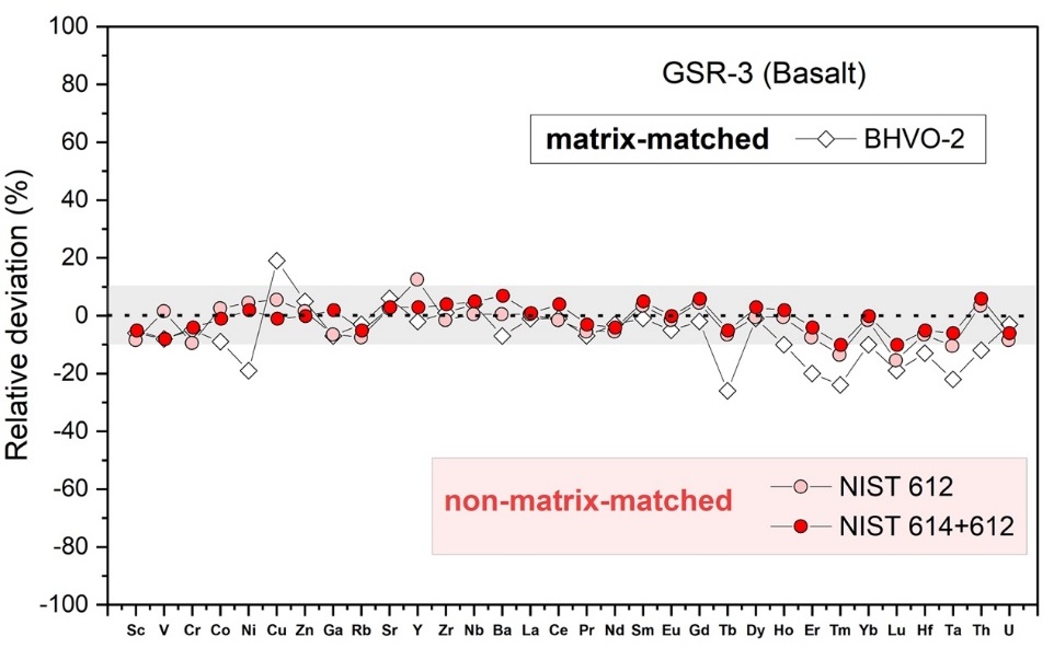图2 基体匹配和非基体匹配外标对玄武岩标准物质 GSR-3分析结果准确度的影响