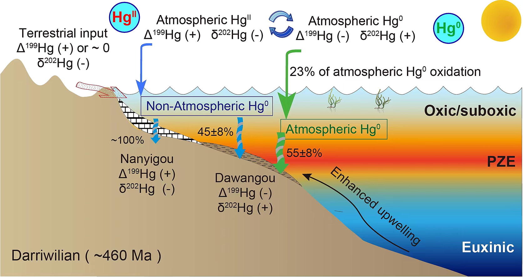 来自塔里木和华南地区的证据表明,达瑞威尔期(中奥陶世)中纬度海域经历了一系列海洋化学和气候动荡,这一不稳定性可能对海洋生物多样性产生了深远影响。尤其在中-上奥陶纪过渡期,深水斜坡和盆地相沉积物显示出显著的海洋环境变化。在塔里木地区的研究中,汞同位素分析揭示,中奥陶纪的斜坡-盆地相环境中曾多次发生PZE。PZE是指在海洋的透光层(通常位于海水深度小于200米深度)中,硫化氢(H2S)浓度显著升高的现象。透光层是阳光能够穿透的区域,支持光合作用,但在PZE下,这里的氧气含量大幅降低或几乎消失,形成了极度缺氧的环境,取而代之的是硫化氢。硫化氢作为一种有毒物质,出现在透光带这一海洋生物最为集中的栖息地区域,具有灾难性影响,特别是对依赖氧气生存的生物,会导致生物多样性的急剧下降。此外,研究建立数值模型表明,约23%的大气汞可能因高浓度的溶解硫化氢而被封存于海洋沉积物中,这些有毒的金属元素从大气进入海水中,对浅海活跃的生物造成进一步的打击。