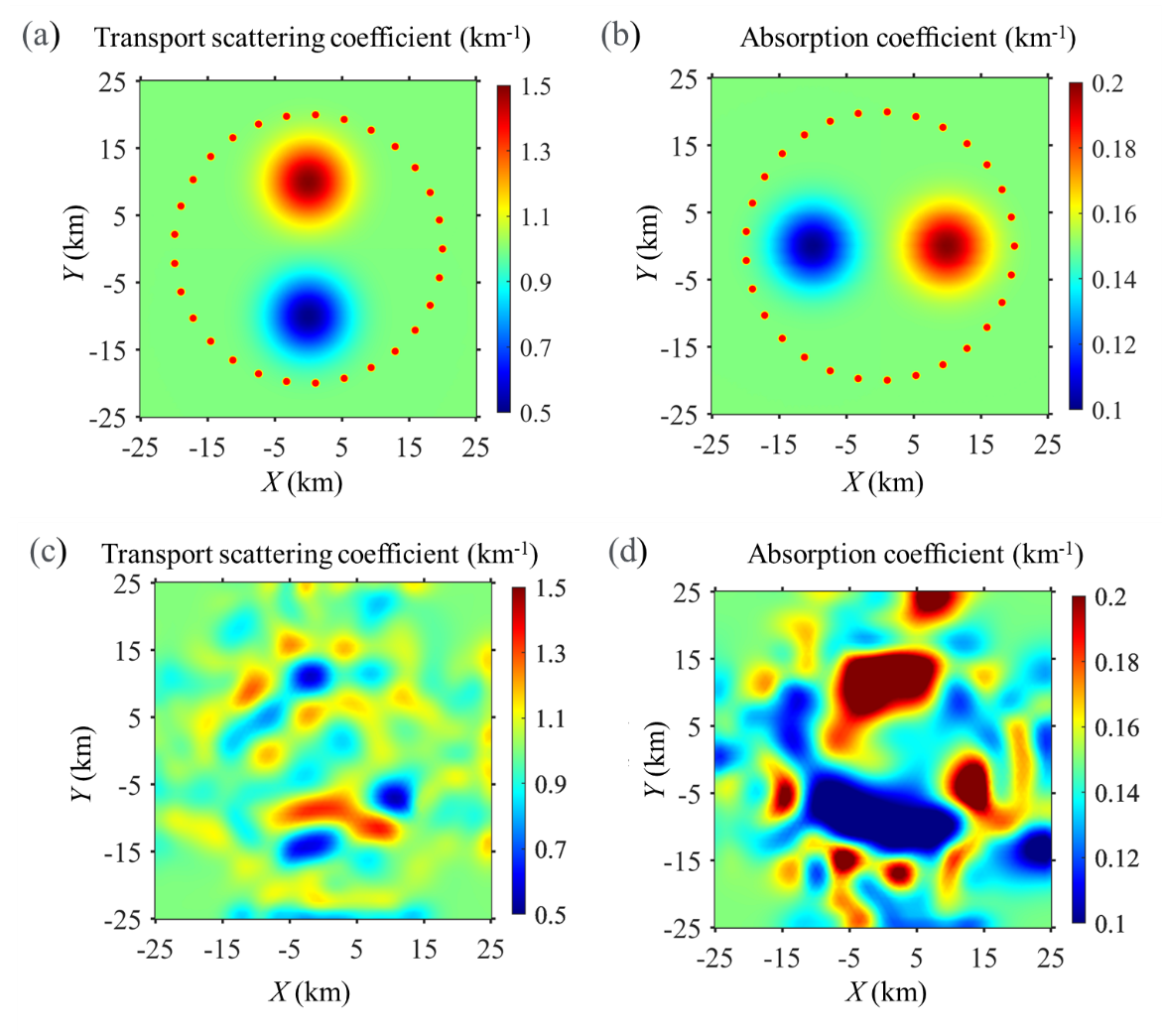 图1 高斯异常衰减模型:(a)和(b)分别展示了传输散射系数和吸收系数的空间分布,红色圆点表示震源和台站的位置。在反演过程中使用了不符合频率选择准则的0.05 Hz、0.1 Hz和0.2 Hz等频率的能量数据,这导致反演陷入局部极小值,从而影响了高斯模型中传输散射系数(c)和吸收系数(d)的反演结果