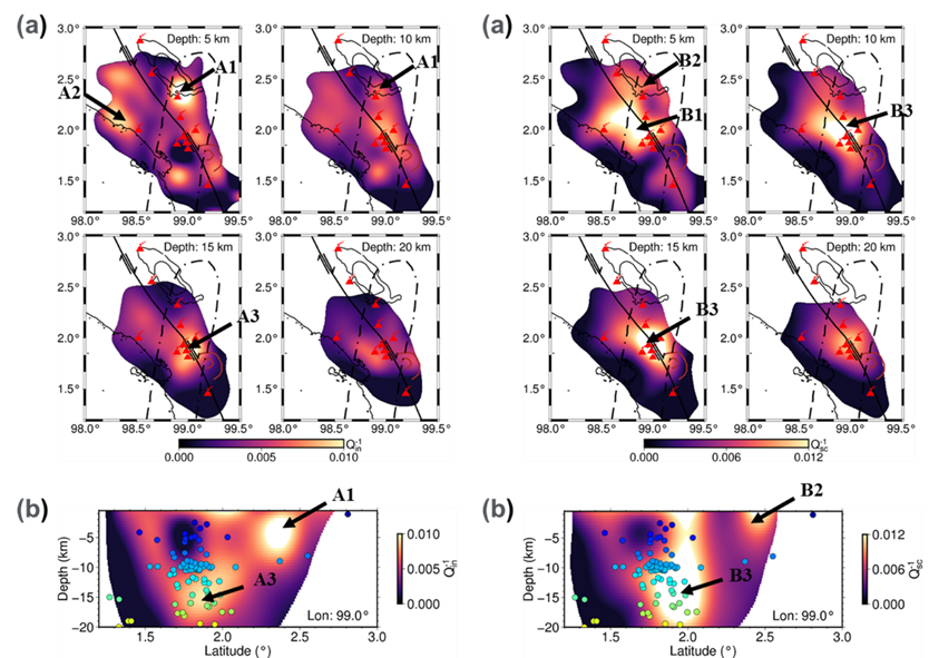 在更为复杂的情形下,研究团队采用蒙特卡罗方法,通过追踪能量粒子的传播过程数值求解辐射传输方程,进而生成衰减敏感核,以揭示地球内部散射与固有衰减的空间分布特征。为克服计算瓶颈,研究团队提出了一种基于两阶段扰动蒙特卡罗方法计算敏感核的新方案。该方法首先通过一次模拟识别台站能够捕获的能量粒子,随后在第二次模拟中专注于追踪并记录这些被捕获粒子的相关信息。与传统方法需要存储和处理所有能量粒子的信息不同,该方法仅聚焦于台站捕获的能量粒子,从而显著减少了内存占用和计算成本,并实现了与三维地震速度模型的有效结合。将这一创新方法应用于北苏门答腊的Toba火山区域,研究结果揭示了火山口周围存在的高固有衰减异常区,暗示了岩浆房的存在;同时,沿苏门答腊大断层发现的高散射衰减异常可能与断层带的复杂结构密切相关(见图3)。散射与固有衰减异常的重叠区域进一步表明,岩浆活动可能对Toba火山口以南的地震活动产生了重要影响(见图4)。