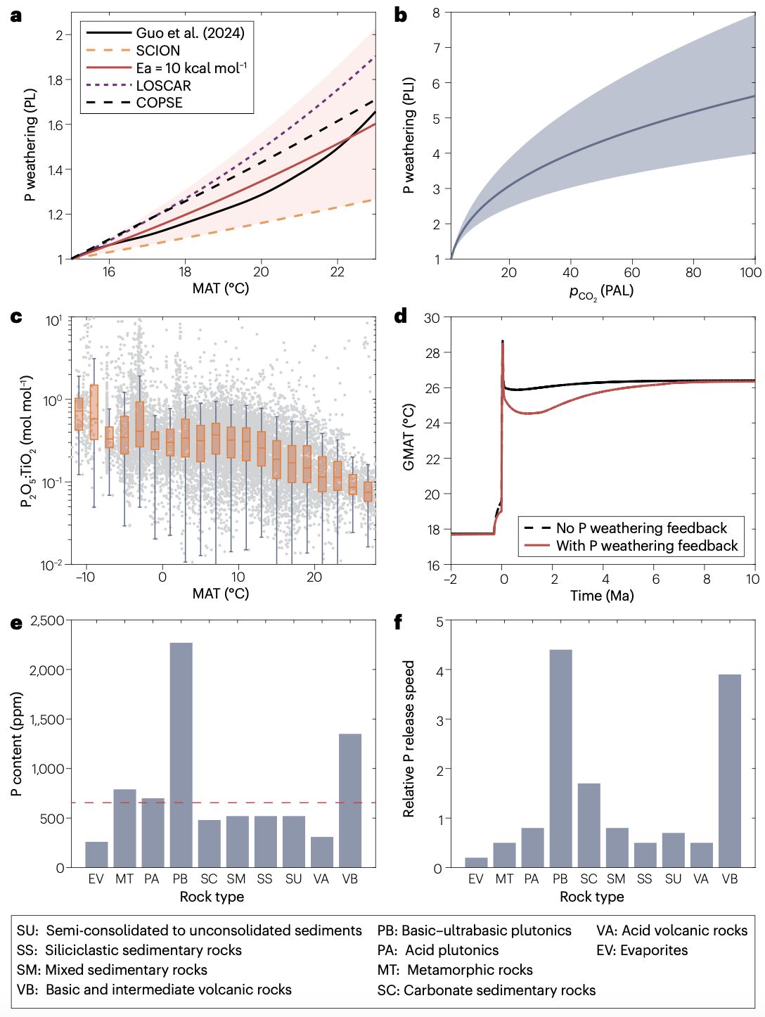 图2 温度和岩石类型对磷风化的影响。a. 基于数据(黑线)得到的全球年均温度(GMAT)与磷风化的关系,并与全球生物地球化学循环模型中的关系进行比较;b. 无机磷风化与大气CO2分压的关系;c. 全球表土中P2O5:TiO2与年均温度(MAT)的关系;d. 磷风化反馈在二叠纪–三叠纪大灭绝事件期间对气候的影响;e. 现代大陆岩石中的平均磷含量;f. 磷释放比例(%)与总陆地出露面积的比例(%)。PAL-当前大气水平;PLI-由无机过程引起的当前磷风化