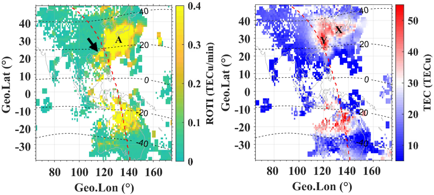 图1 2024年10月11日20:00 UT(左)ROTI地图表征的超级EPB与(右)TEC地图表征的等离子体斑块结构。“A”所示为延展至磁纬40°的超级EPB结构,“X”所示为EPB极侧的等离子体斑块结构,“Y”所示为EPB西侧的等离子体斑块结构,黑色虚线所示为地磁纬度,红色虚线所示为日出线