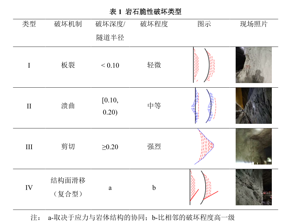 在此基础上,基于围岩破坏深度与洞室半径之比把岩石脆性破坏严重程度分为轻微、中等、强烈和极强四个等级(见表2)。