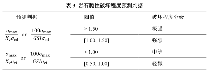 时,岩石剪切破坏会增加,导致强烈的脆性破坏。考虑到围岩与岩石的差异,他们创新性引入岩体完整性系数Kv或地质强度指数GSI对预测判据进行校正(如表3所示)。