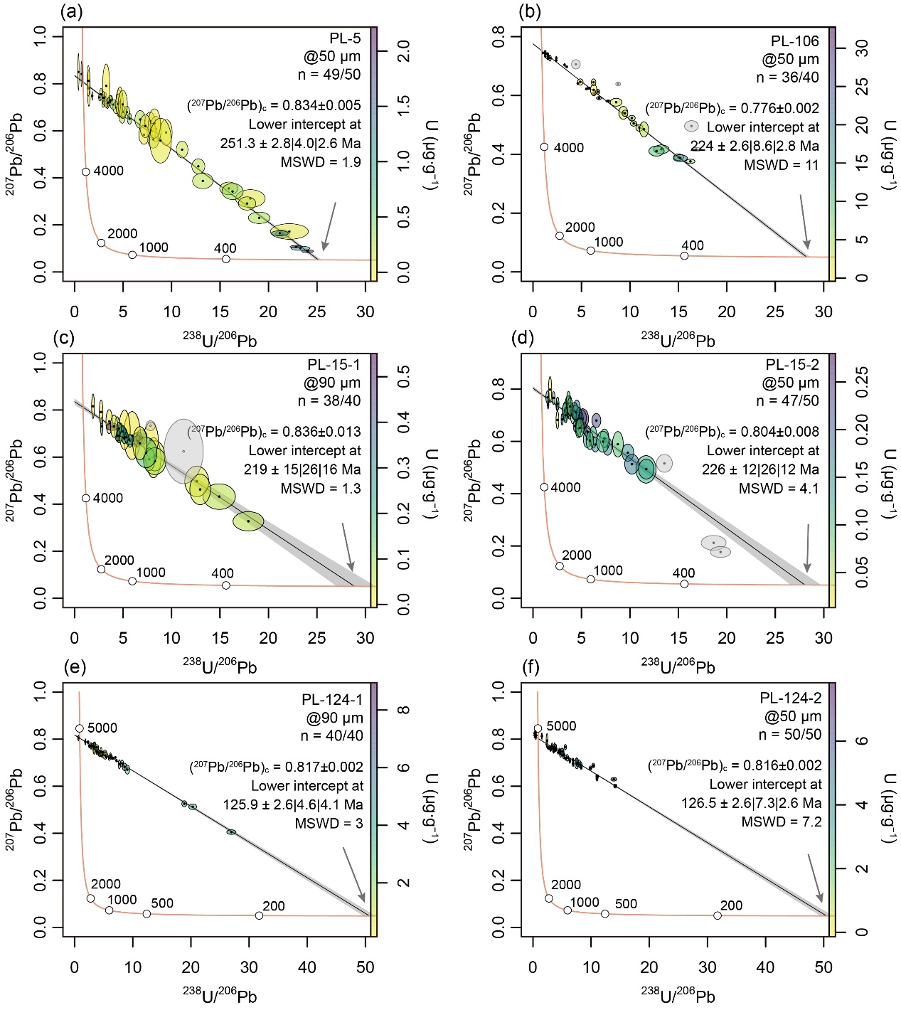 图1 方解石U-Pb定年结果。年龄不确定性为2σ;MSWD:平均标准权重偏差;灰色图标表示被舍弃的数据点;子图右侧的颜色条表示铀(U)浓度