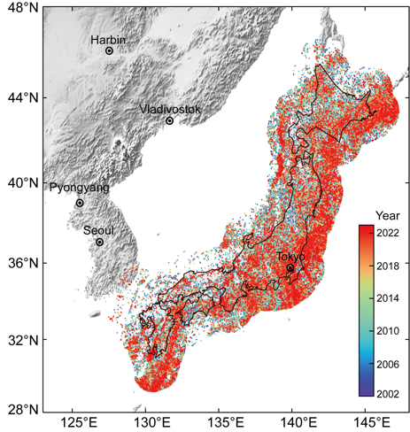 图1 日本本岛及周边100km范围内地震事件分布。时间窗口:2002年6月至2023年6月