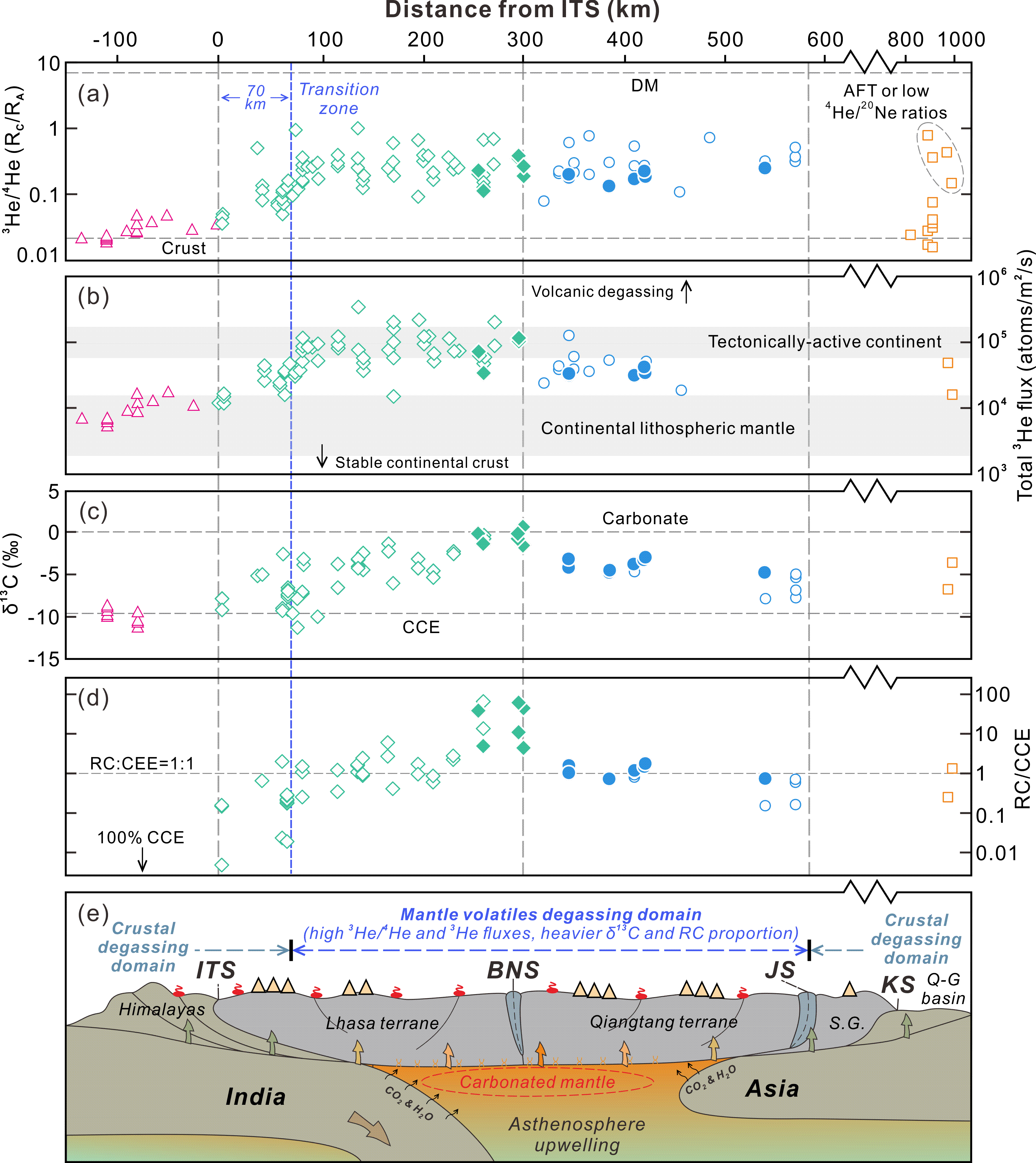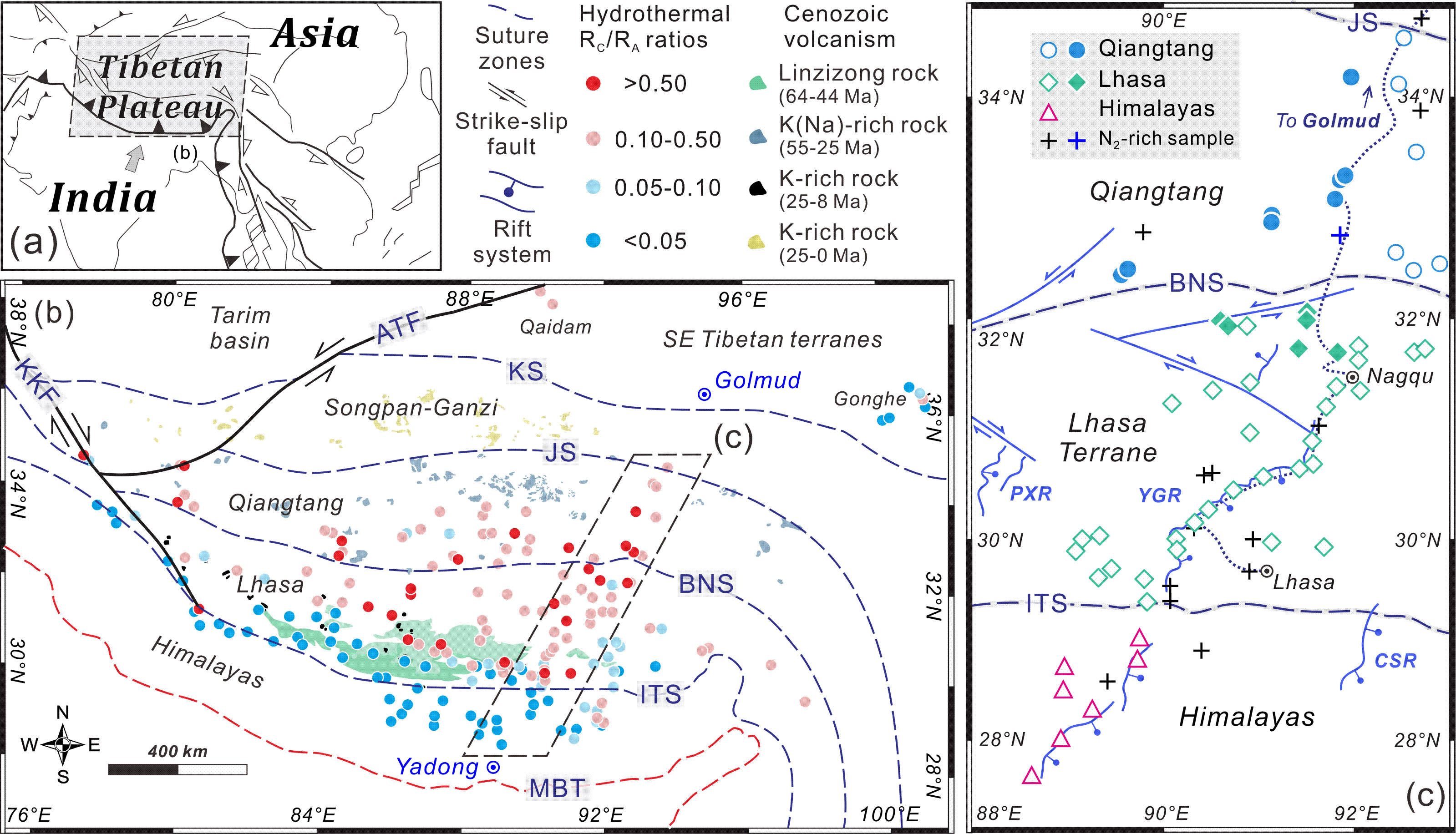 火山气体及其携带的地球化学信息是揭示地球深部物质循环、岩石圈结构与板块汇聚动力学过程的有效指标。利用火山气体探讨大陆碰撞、俯冲及其相关的深部物质循环过程是研究大陆碰撞造山带深部碳循环的重要途径。作为印度-欧亚大陆汇聚拼合的产物,青藏高原是研究大陆碰撞带深部碳循环的关键地区。然而,受限于高海拔和采样难度,以往的研究多集中于高原南部的喜马拉雅与拉萨地块,对于青藏高原腹地羌塘地块的火山气体地球化学数据长期匮乏,导致高原北部深部碳循环过程与大陆俯冲的关联机制不明。针对这一科学问题,800彩票岩石圈演化与环境演变全国重点实验室郭正府研究员团队系统分析了青藏高原北部火山区温泉气体的化学组成(包括CO2、CH4等)及He、C同位素特征,探讨了近南北向横跨青藏高原的火山气体同位素演变机制,揭示了青藏高原深部碳循环过程及其与大陆俯冲的动力学联系,为理解大陆碰撞带深部碳的来源、释放通量与气候效应提供了新视角。