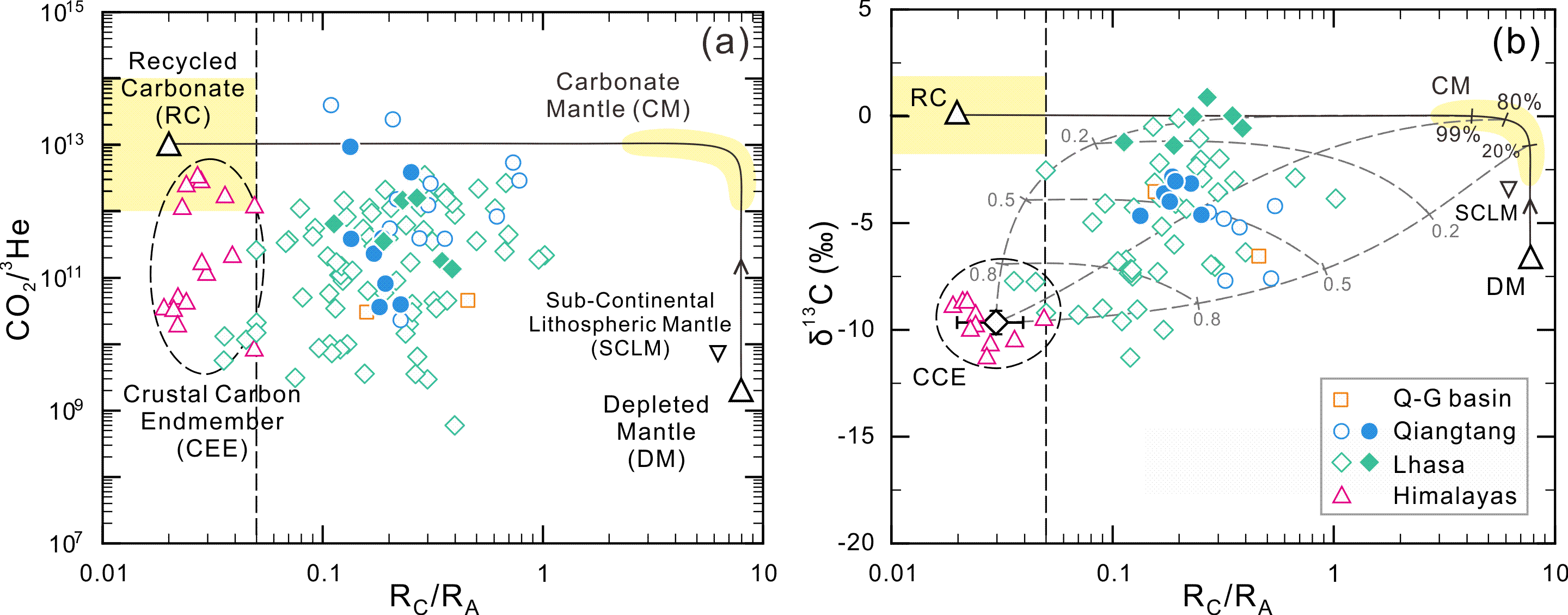 研究团队在青藏高原拉萨地块北部和羌塘地块的火山区采集了15个热泉气体样品,研究结果表明,高原北部低CO₂的样品(成分以N2为主)明显经历了碳酸钙沉淀、有机质混染等地表过程,从而呈现相对较轻的δ¹³C值与低的CO₂/³He比值,而高CO₂的样品(成分以CO2为主)则几乎不受地表过程或同位素分馏的影响,显示出相对较高的³He/⁴He比值(0.11–0.39 RA,显著高于地壳值)和重的δ¹³C值(-4.66‰至0.02‰);结合明显较高的CO₂/³He比值(36–9,400×10⁹),提出挥发分中存在地幔来源的碳酸盐组分(图2)。通过构建耦合的He-C同位素模型,发现从南向北,地幔(DM)及再循环碳酸盐(RC)来源碳的比例逐步增加,而地壳碳组分(CEE)减少。这一发现明确了青藏高原中北部地幔经历了显著的碳酸盐交代作用,为深部碳的储存和释放提供了挥发分地球化学研究的新证据。