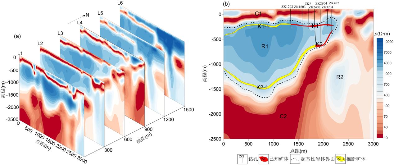 探测结果显示(图4),SOTEM 技术成功揭示了测区内地层由浅及深整体呈现低阻-高阻-低阻的变化特征。浅地表的低阻层反映了新生代覆盖层,其下方的高阻体可能是超基性岩体,而深部地层的低阻特征可能与岩石蚀变有关。在 L3 测线上,他们发现了矿体主要集中在岩体的内接触带蚀变壳内,且推测可能存在更大体量的矿体。这一探测成果不仅验证了 SOTEM 技术在深部矿产勘探中的有效性,还为周庵矿区的深部找矿提供了重要依据。