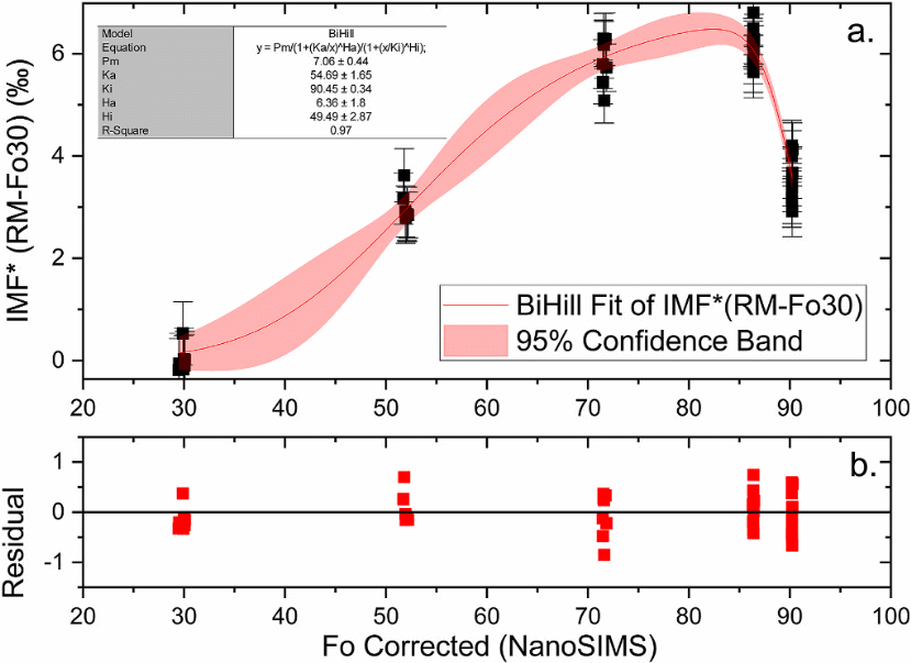 针对现存问题,800彩票纳米离子探针实验室郝佳龙高级工程师与田恒次研究员、綦超研究员等人合作,采用高温高压实验并结合地外阜康橄榄陨铁陨石等,最终成功获得了成分均一且Fo值覆盖0-90范围的橄榄石标样(图1)。在此基础上,研究团队利用CAMECA NanoSIMS 50L纳米离子探针,成功建立了橄榄石Fo值-基体效应在线校正方法,并创新性的引入了BiHill方程(图2)。该方法能够同时测定Fo值和镁同位素,大大节约了引入电子探针的时间,并且在1微米的分辨率下同位素精度还能达到0.7-0.8‰。