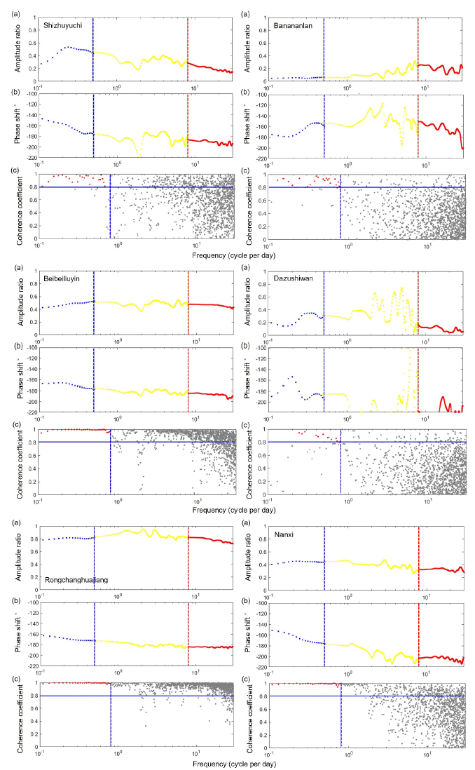 图2 2017年1月至3月期间五口监测井(原7口监测数据中,万州溪口井因受长江周期性水位波动干扰导致数据失效,已予剔除)的气压响应函数(BRFs)及其与地下水位的相干系数分析结果。(a、b)基于60天滑动时窗计算的BRFs分布:采用功率谱密度分析和传递函数法计算-三频段划分标准:低频(<0.5 cpd,蓝色)、中频(0.5-8 cpd,黄色)、高频(>8 cpd,红色)- 频段边界由垂直虚线标注(蓝色虚线:0.5 cpd;红色虚线:8 cpd);(c)对应时段的气压-水位相干系数分析:- 红色数据点表示超过高相干阈值(>0.8)的有效频段,这些数据被选用于后续渗流模型计算- 可靠性判定标准:蓝色水平实线(相干系数阈值0.8)与蓝色垂直虚线(截止频率0.8 cpd)共同界定有效数据范围,高于该频率的观测数据因信噪比不足被剔除