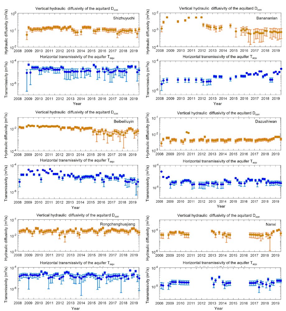 研究结果显示:(1)反演获得的含水层导水系数与传统抽水试验结果具有良好一致性;(2)基于2008-2019年的连续观测数据,研究区六口监测井中有五口井的隔水层垂直水力扩散系数较含水层水平导水系数至少高出两个数量级;(3)尽管多次区域性和远场地震引发了部分低垂向渗透性井孔的水位异常波动,但未观测到显著的水力特性变化;(4)参数时序分析揭示了水文地质特性的两个变化模式——年际尺度上的渐进性演变和季节性周期波动。