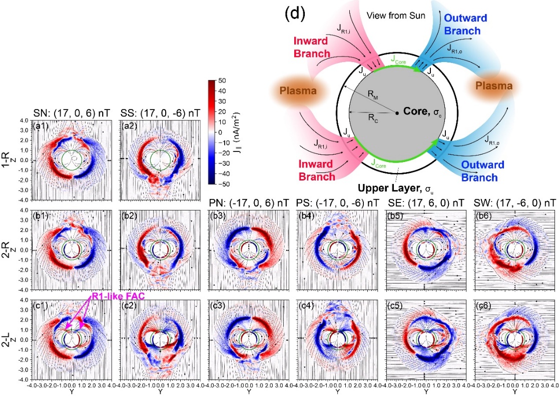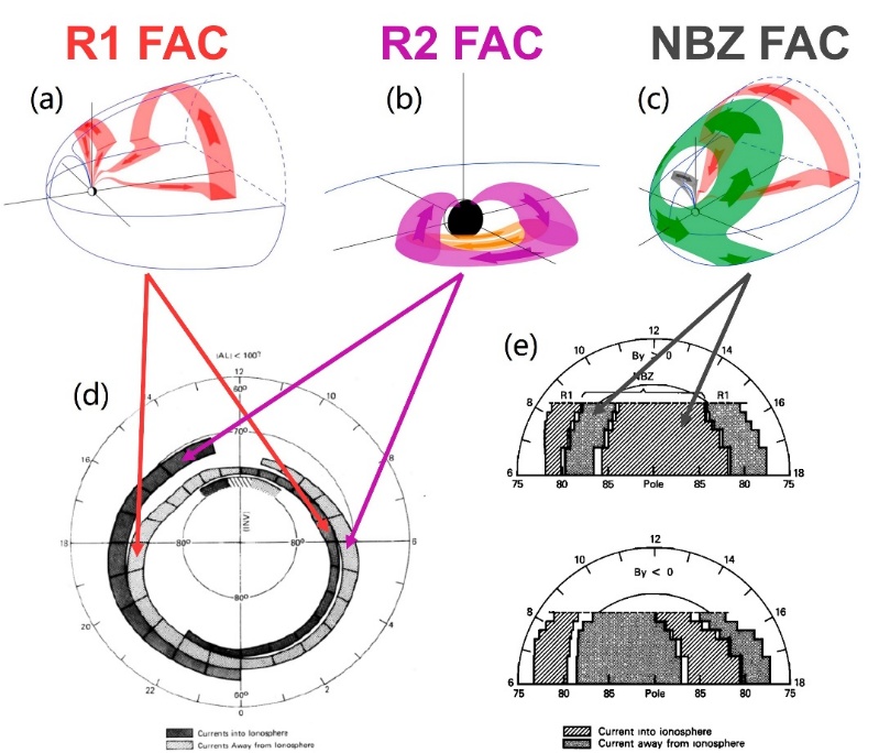 地球的大尺度场向电流依据其分布形态大体可以分为三类:1区场向电流,2区场向电流,以及NBZ场向电流(图2)。地球场向电流通过电离层完成闭合。1区场向电流从晨侧流入电离层,从昏侧流出电离层;2区场向电流则分布在1区场向电流的赤道侧,它从昏侧流入电离层,从晨侧流出。NBZ场向电流在正午附近1区场向电流的极向侧,从午后流入电离层,从午前流出电离层。大量研究表明,地球场向电流的分布会显著受太阳风磁场方向的调制。