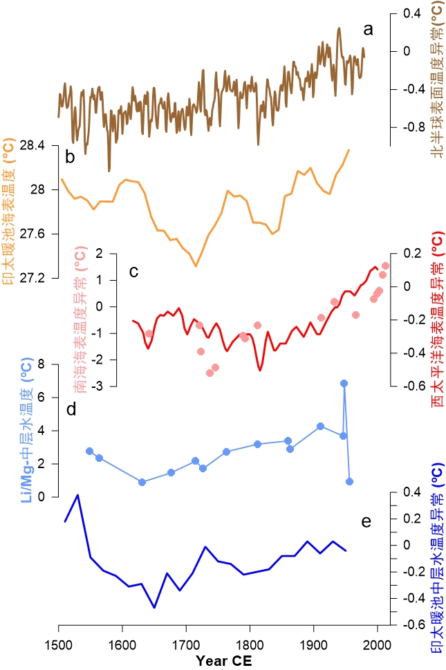 研究团队进一步对冷水珊瑚的珊瑚杯结构和共骨结构进行了系统的地球化学指标分析,发现这两种结构的Mg/Ca和Li/Mg比值具有一致性,但在δ13C,δ18O,δ11B,Sr/Ca,B/Ca,Ba/Ca,U/Ca等指标上表现出显著差异(图2)。这种差异反映了珊瑚的“生命效应”特征,可能与珊瑚不同结构的钙化机制差异有关。基于年代学和地球化学的综合分析,研究团队成功重建了南海中层海水近500年的环境演变历史。研究发现,Ba/Ca比值呈现持续下降趋势,揭示了南海区域营养生产力的降低或北太平洋中层海水通风的减弱(图3)。特别值得注意的是,利用Li/Mg比值重建的中层海水温度显示,20世纪以来中层海水温度显著上升,这一发现为人类活动对深海环境的影响提供了直接的证据(图4)。