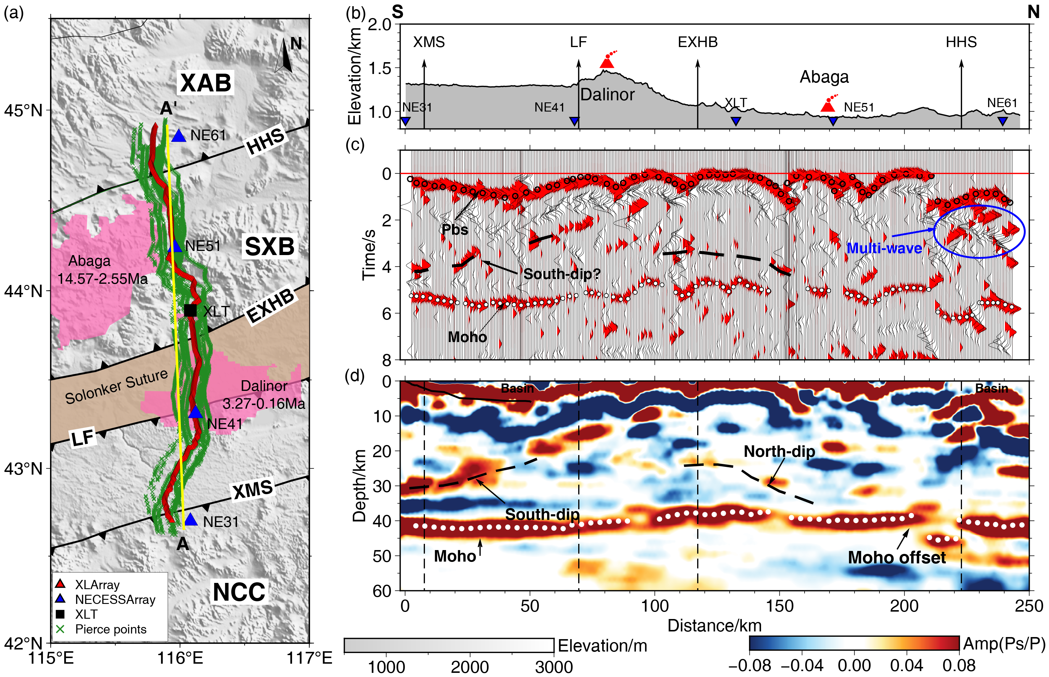 为此,800彩票地球与行星学科中心博士生潘冬雪,在导师陈棋福研究员与王新特聘研究员和吉林大学许文良教授的指导下,利用中亚造山带东段布设的一条长约250 km的短周期密集地震测线,以及测线邻近的4个NECESSArray宽频带地震台站和锡林浩特固定地震台站(图2a)的观测资料,基于相干接收函数方法(Coherent Receiver Function, CRF; Wang et al., 2021)对索伦和贺根山两条缝合带的地壳结构进行了成像分析(图2)。接收函数成像结果(图2d)在索伦缝合带中下地壳成功识别出了规模较大且稍有间断的北倾和南倾正信号,可能反映了古亚洲洋南北双向俯冲板片界面的信息。而在贺根山缝合带处,虽未见明显的倾斜结构,但观测到显著的Moho面间断,可能是古亚洲洋北向俯冲相关构造特征的反映。
