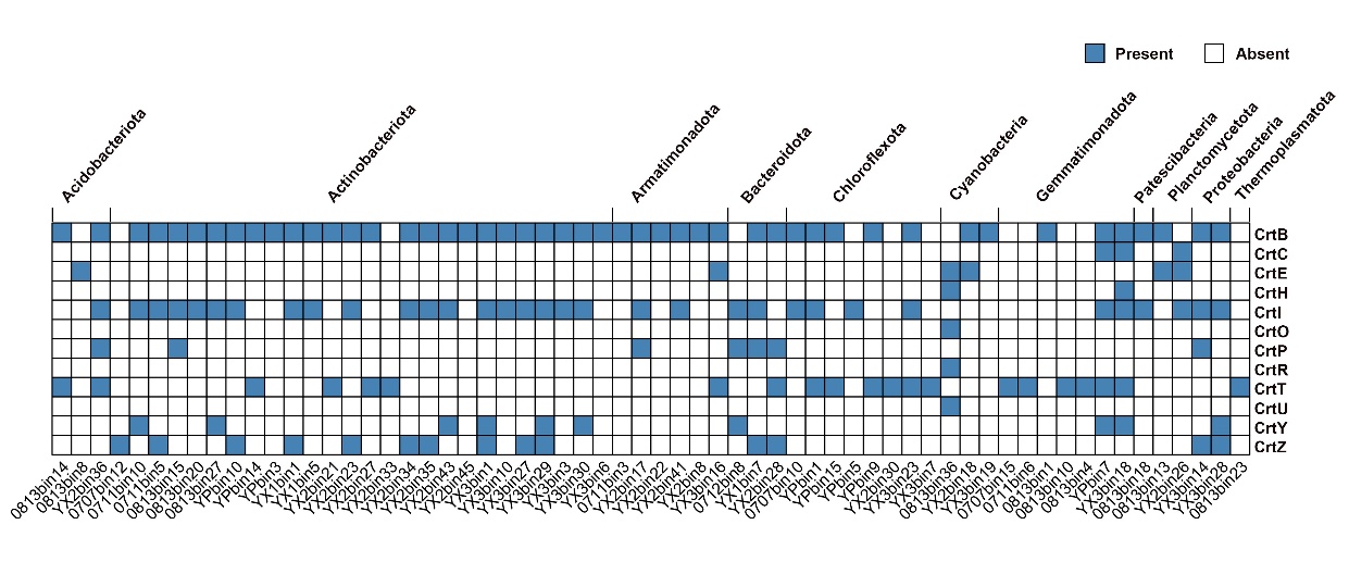 图3 柴达木盆地土壤细菌和古菌基因组中检测到与类胡萝卜素生物合成相关的crt基因。这些基因主要分布在放线菌门(Actinobacteriota)、绿弯菌门(Chloroflexota)、芽单胞菌门(Gemmatimonadota)、装甲菌门(Armatimonadota)、蓝细菌门(Cyanobacteria)等微生物类群
