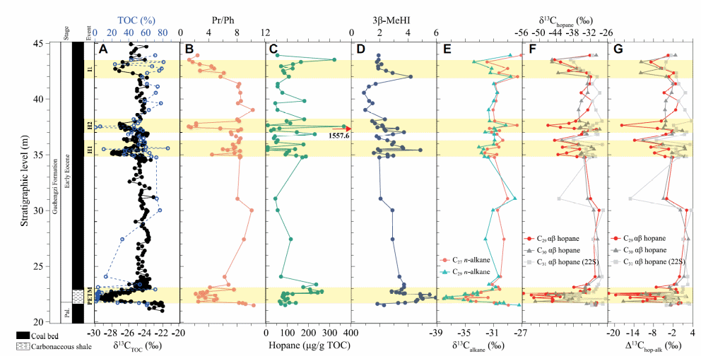 图2 抚顺盆地煤层生标重建结果。(A)总有机碳含量和碳同位素组成;(B)姥鲛烷与植烷的比值;(C)藿烷含量;(D)3β-甲基藿烷指数;(E)正构烷烃单体碳同位素组成;(F)藿烷碳同位素组成;(G)藿烷与正构烷烃单体碳同位素差值。黄色条带分别代表了PETM、H1、H2和I1四次极热事件