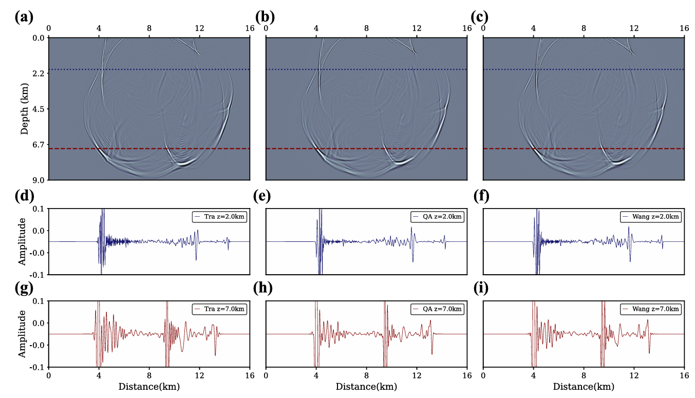 图2 波场快照对比。(a-c) 分别为采用传统Taylor展开方法、量子退火方法和Tikhonov正则化方法得到的差分算子在盐丘介质上的正演模拟结果;(d-f)对应2 km深度处的波场切片;(g-i)对应7 km深度处的波场切片
