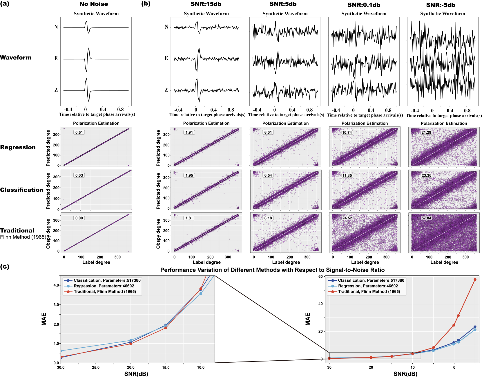 图1 深度学习方法(回归、分类)与传统方法在理论数据集中随信噪比变化的预测误差对比。(a)不同方法在纯理论数据集(无噪声)上的结果;(b)不同方法在含噪声的理论数据集上随信噪比(SNR)变化时的对应结果;(c)不同方法随SNR变化下的平均绝对误差(MAE)结果折线图