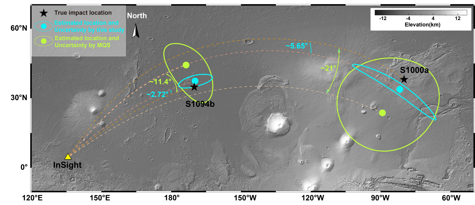 图2 火星撞击事件S1094b和S1000a的定位结果对比