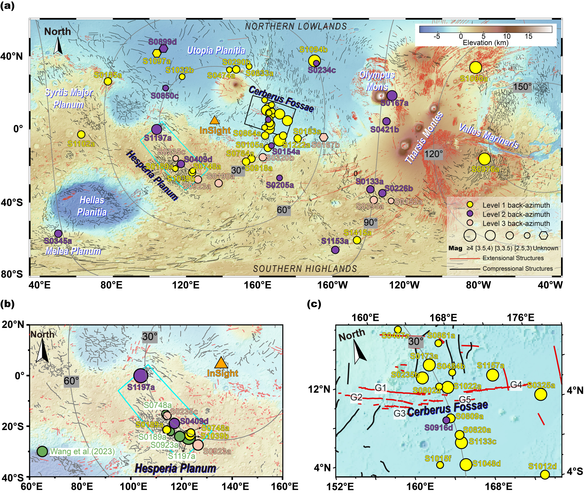 图3 低频家族火星震的空间分布图。(a)火星震重定位完整分布图;(b)赫斯珀里亚高原(Hesperia Planum)区域的火星震分布及与前人定位结果的(Wang et al., 2023)对比;(c)刻耳柏洛斯堑沟(Cerberus Fossae)区域的火星震分布局部放大图
