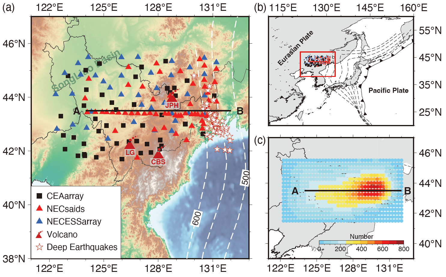 图1 台站分布与中心点分布示意图。(a)AB为沿着43.5°N的剖面,白色星形代表震源深度超过380 km的深源地震。缩略词:SLB,松辽盆地;JPH,镜泊湖火山;LG,龙岗火山;CBS,长白山火山;(b)红色方框圈定了研究区位置;(c)每个单元格内叠加的噪声互相关函数的数量