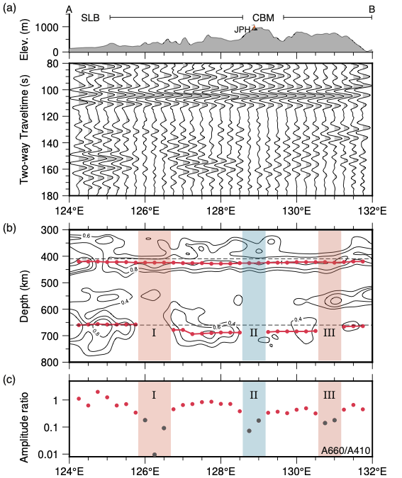 800彩票地球与行星物理学科中心的地球-行星内部结构与过程学科组博士生陈思丹与导师李娟研究员,联合陈棋福研究员,王巍特聘研究员,杨凡博士后以及博士毕业生张理蒙,利用地震噪声约束了中国东北地区下方的地幔转换带结构。该研究依托于国家地震科学数据中心与区域密集流动地震台阵NECsaids和NECESSArray记录的连续地震波形数据(图1),从地震噪声中恢复了极其微弱的地幔转换带上下界面反射体波信号(P410P与P660P),成功获取了研究区410-km和660-km间断面的横向深度变化,为深入理解中国东北下方的地幔结构与俯冲板片相互作用等动力学过程提供了新的地震学观测证据。