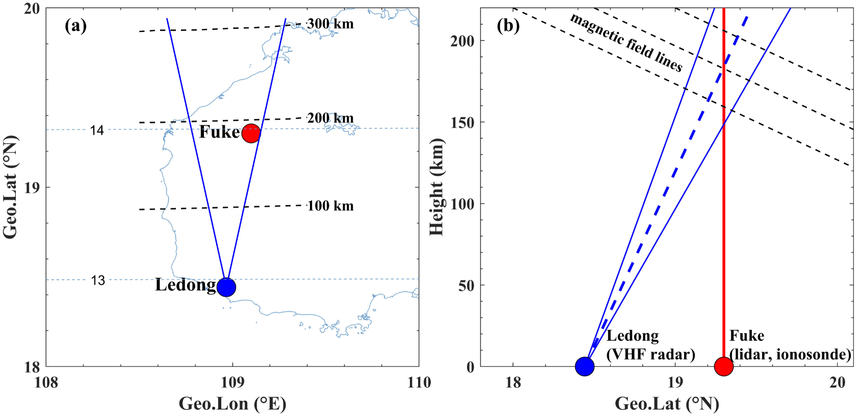 图1 海南乐东MIOS VHF雷达与儋州激光雷达地理位置与观测视场。其中蓝色实线框定VHF雷达在(a)方位角和(b)仰角方向的波束,蓝色虚线为波束中心,红色实线为激光雷达垂直探测波束,(a)中黑色虚线为乐东视线方向在不同高度垂直于磁力线的位置,(b)中黑色虚线为磁力线