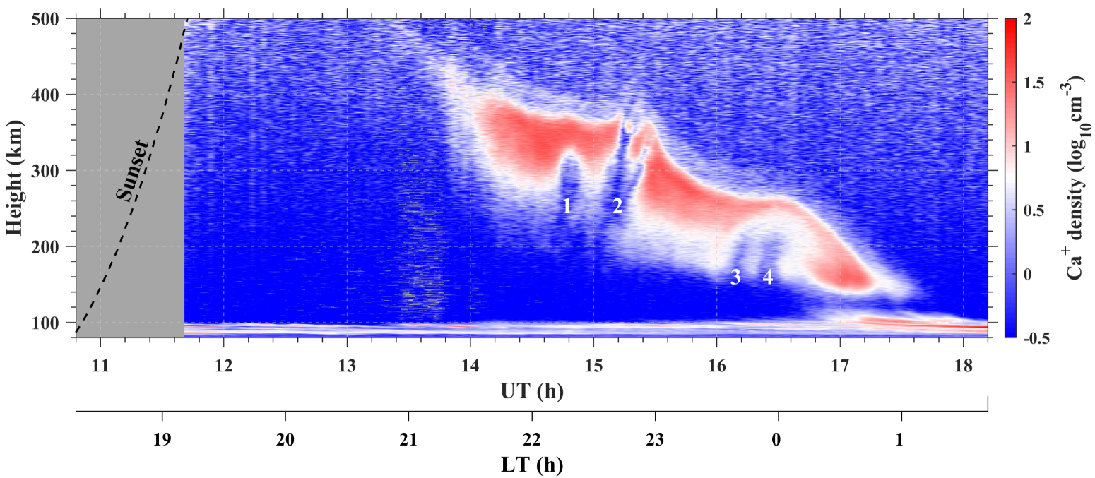 图2 2024年10月31日儋州激光雷达观测的钙离子剖面,白色数字标出了剖面中的密度耗空结构,黑色虚线为不同高度的日落时间
