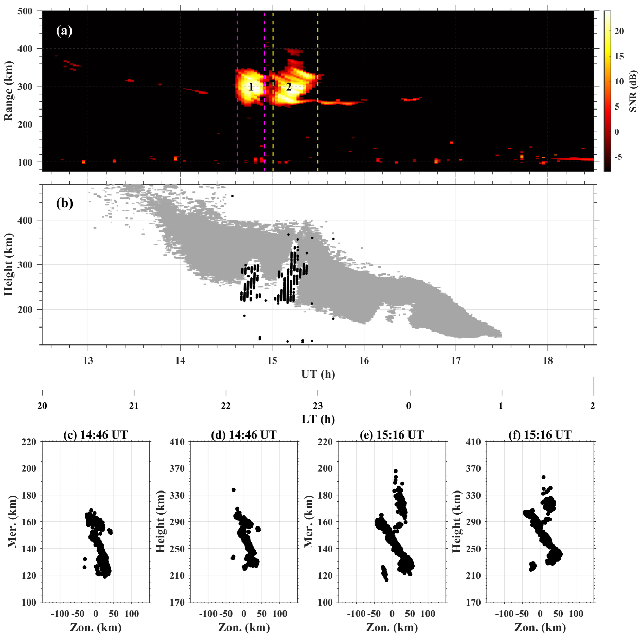 图3所示为同一时段MIOS VHF雷达的探测结果。结果显示,雷达在14:30-15:30 UT观测到2团等离子体泡不均匀体后向散射回波,回波出现时间与激光雷达钙离子剖面中的耗空结构1和2一致。基于雷达干涉成像,得到不均匀体的形态结构(图3b中的黑色散点),恰好与钙离子团块中的耗空区域1和2吻合,其中雷达干涉成像得到的结构2分叉形态也与激光雷达观测结果一致。VHF雷达的观测结果证实激光雷达钙离子剖面中的耗空/分叉结构为等离子体泡。然而,对于低至电离层谷区高度的耗空结构3和4,VHF雷达并未观测到对应的不均匀体回波。