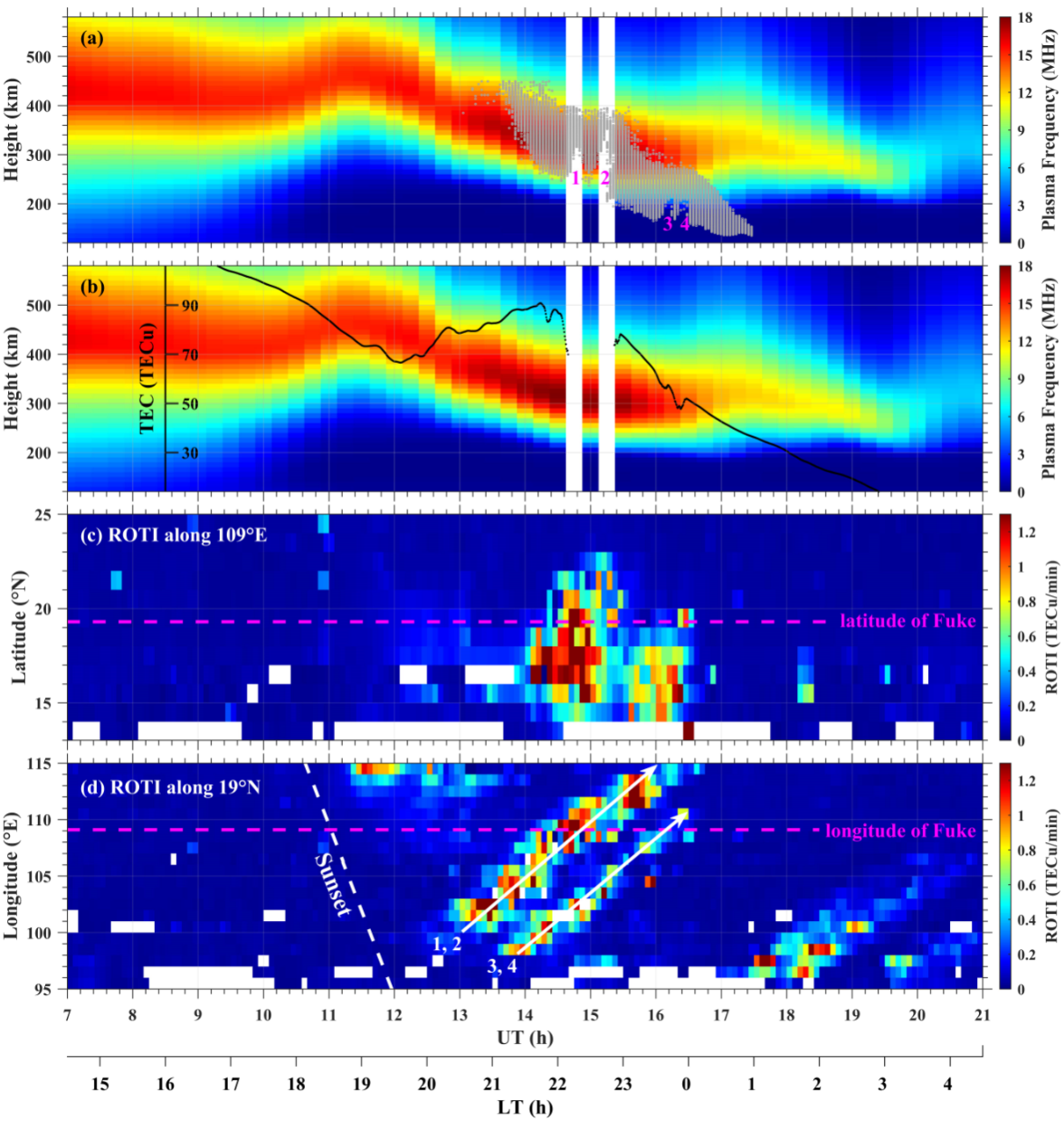 结合电离层测高仪的观测(图4a),发现等离子体泡1和2出现高度与测高仪反演的电子密度剖面F层高度一致,而等离子体泡3和4出现在F层底部以下的谷区。在谷区高度,电子密度很低,因此一般很难观测到等离子体泡结构,而出现在谷区至F区高度的金属离子团块,则类似于“显影剂”,使得谷区和F区的等离子体泡耗空结构都得以“显形”。需要注意的是,等离子体泡结构出现于谷区并不意味着其起源于谷区高度。海南处于低纬地区,其谷区高度150 km沿磁力线对应于磁赤道上空约500 km的F区高度,因此在海南上空观测到的谷区高度等离子体泡实际为磁赤道上空F区高度的等离子体泡沿磁力线的映射结构。进一步利用GNSS观测发现,所有等离子体泡结构,包括低至谷区的等离子体泡3和4,均对应于TEC(电子总含量)耗空(图4b)和ROTI(TEC变化率指数,表征公里尺度不均匀体)增强(图4c-d)。ROTI切片结果表明,等离子体泡3和4处于不均匀体发展末期,此时等离子体泡中的小尺度不均匀体可能已消散,因此VHF雷达无法观测到对应的米级尺度不均匀体回波。
