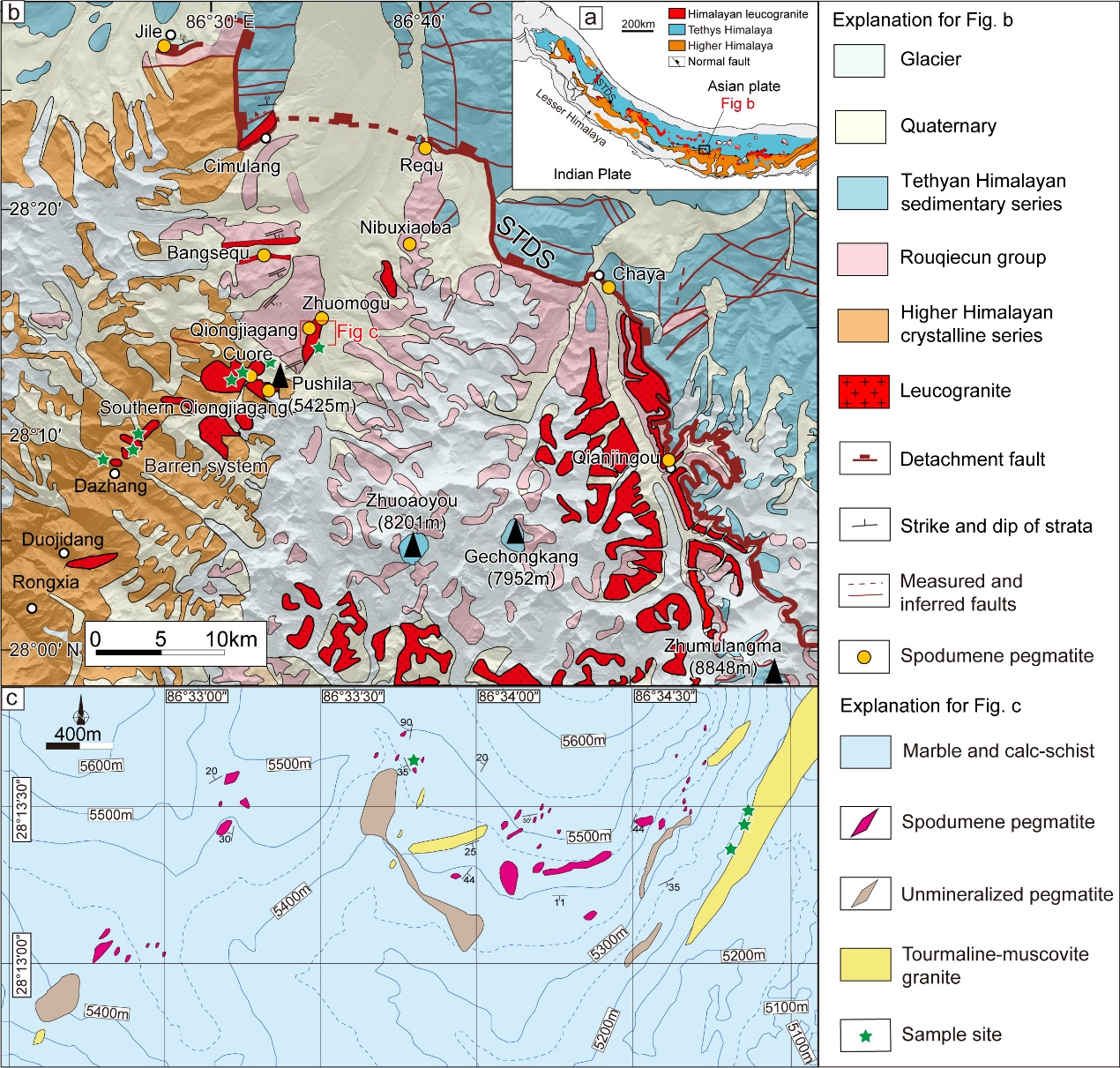 图1(a)喜马拉雅淡色花岗岩分布图;(b)珠峰地区地质简图;(c)琼嘉岗锂矿地质简图