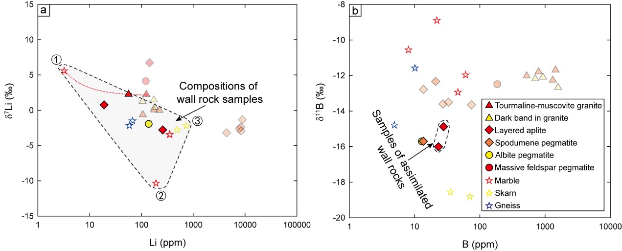 锂和硼作为不相容元素和流体活动性元素,在岩浆演化和热液活动中均可能发生不同程度的同位素分馏。花岗伟晶岩矿床的形成通常经历一系列复杂的过程,例如岩浆分异、流体出溶以及熔/流体与围岩反应等。目前,关于锂和硼同位素在高演化花岗伟晶岩体系中的分馏行为尚缺乏系统性研究。
