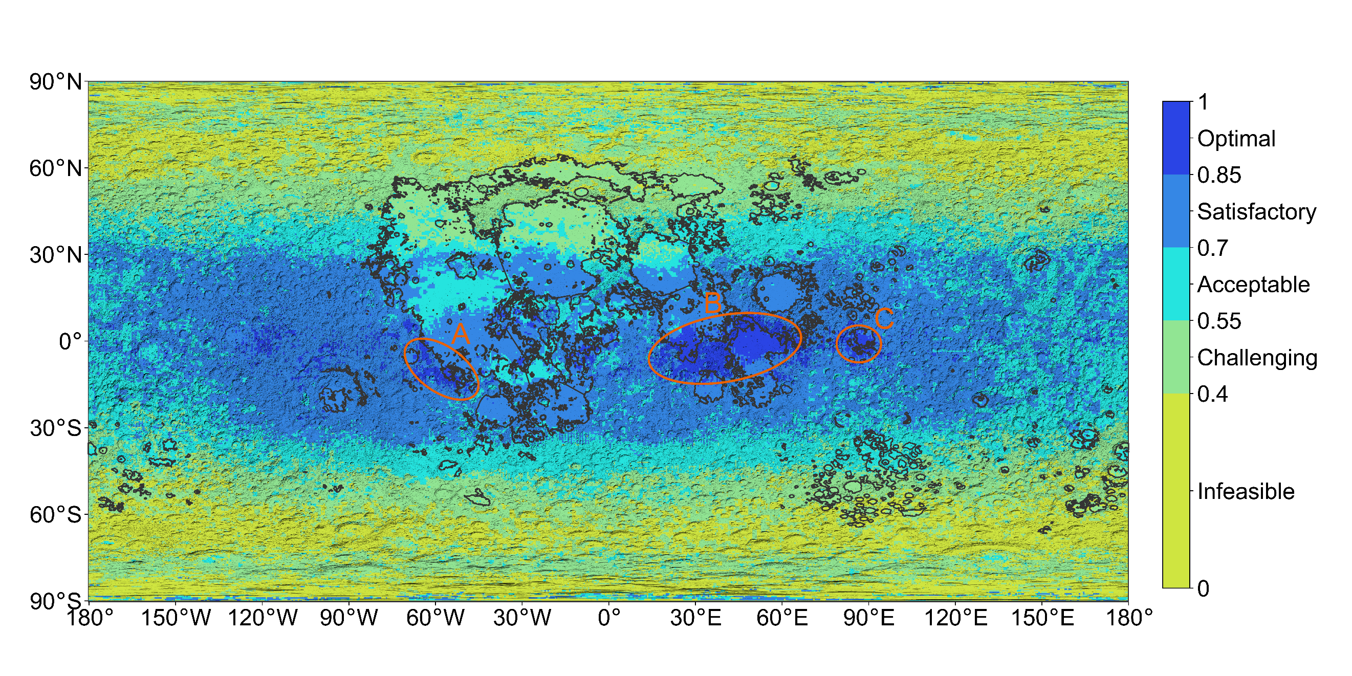 图4 月球基地选址全月适宜性分布图。A、B、C区域是工程地质适宜性最高的区域,A:风暴洋(Oceanus Procellarum)南端;B:岛海(Mare Insularum)南部;C:静海(Mare Tranquillitatis)南部