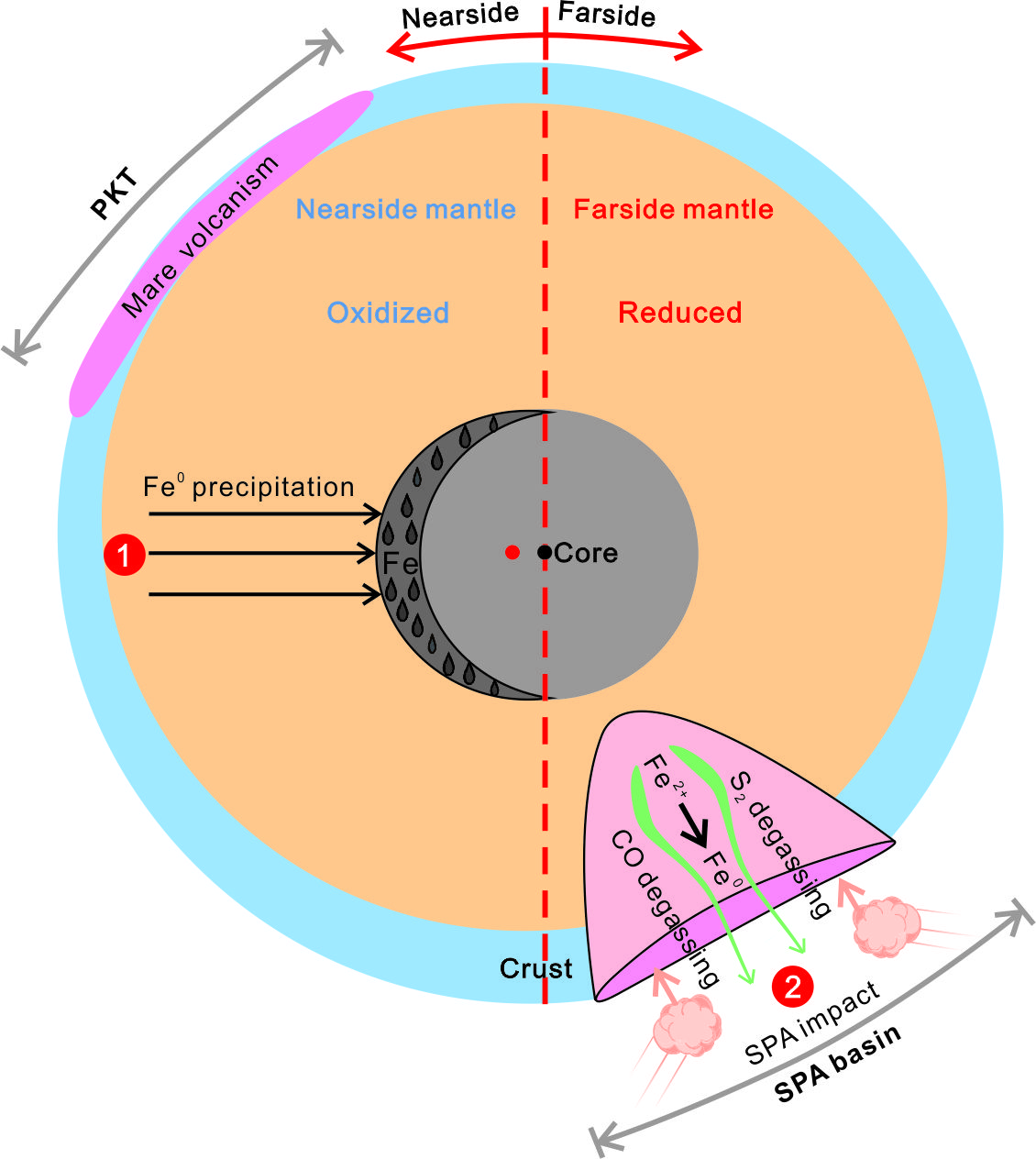 这种月幔氧逸度的二分性可能与月球形成和演化的重大事件相关,可能的机制包括:(1)岩浆洋的不对称结晶导致正面月幔的Fe金属下沉到核部,使其幔部的Fe3+/∑Fe升高,导致正面月幔比背面月幔氧化(图2①);(2)南极-艾特肯盆地形成的大撞击引发大量的S2和CO发生脱气,导致背面月幔的Fe2+→Fe0,从而使该地区的月幔氧逸度降低(图2②)。