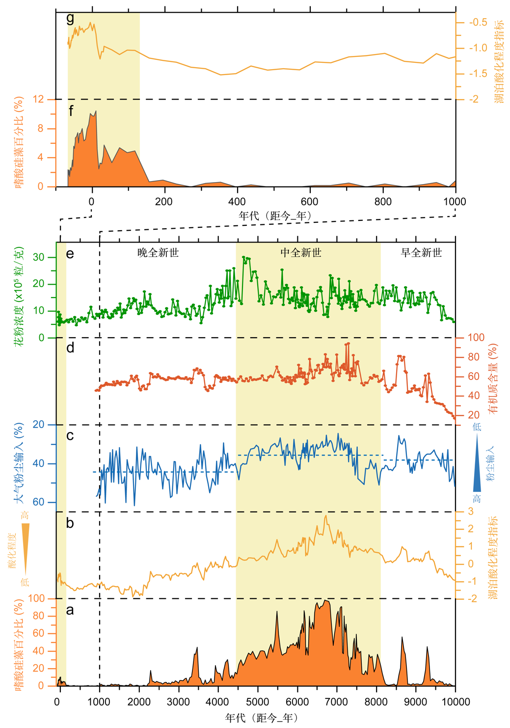 图1 布特哈天池全新世湖泊酸化记录。在中全新世时期,嗜酸硅藻的大量繁盛揭示了湖泊严重的酸化过程。同时,有机质输入的增多与粉尘输入的减少表明,湖泊酸化可能与区域性腐殖质输入的增加以及粉尘沉积的减少有关。过去约100年间,湖泊重现了轻微的酸化趋势,这可能与工业革命引发的酸雨有关