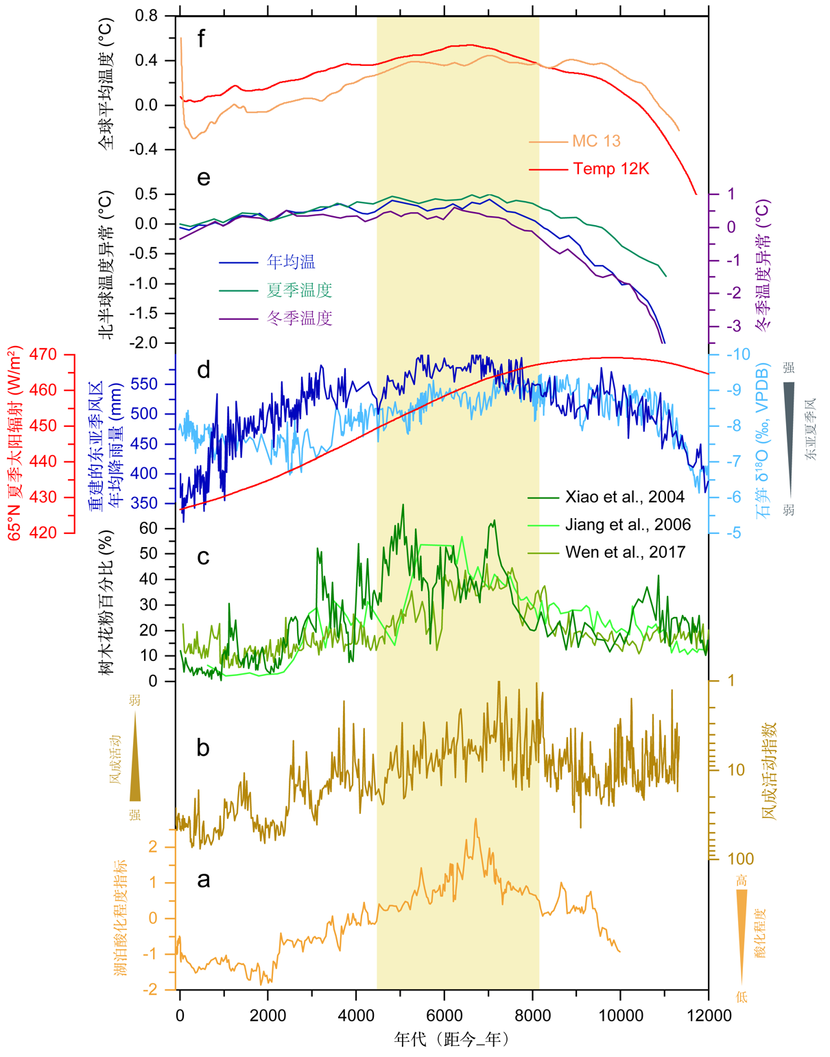 图2 布特哈天池全新世湖泊酸化记录与气候记录对比。中全新世时期,温暖湿润的气候驱动了中国北方地区的植被显著扩张,进而导致干旱半干旱区风成活动减弱。这一过程使得大气粉尘输送相应减少,导致湖泊酸缓冲能力减弱,最终引发湖泊逐渐酸化的趋势